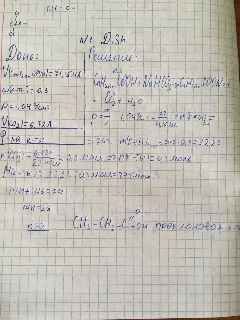 При взаимодействии 71,15 мл 30%-ного раствора (плотность 1,04 г/см3) неизвестной органической одноосновной кислоты с избытком гидрокарбоната натрия выделилось 6720 мл газа (н.у.). Определите, какая кислота находилась в растворе.