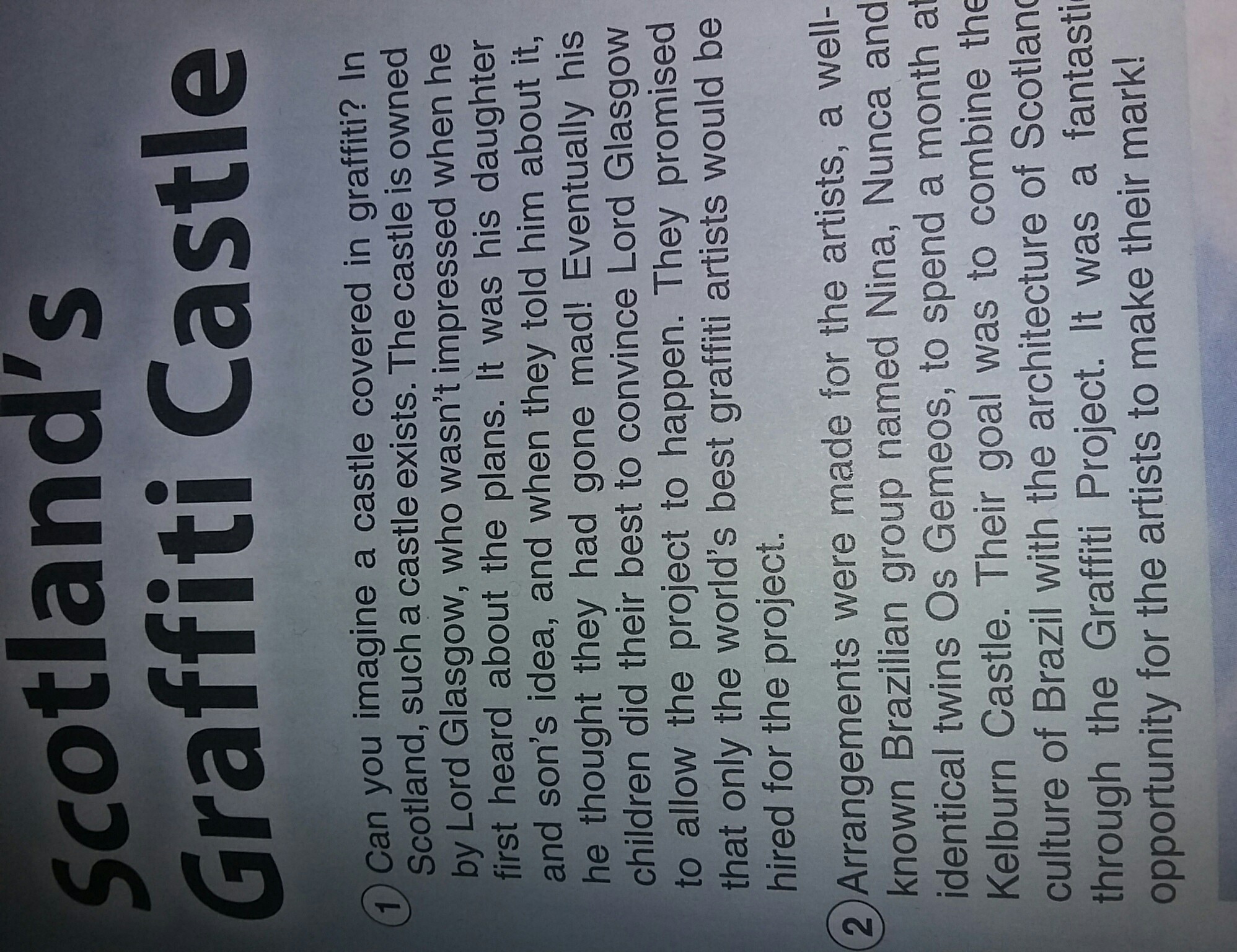 1) можете ли вы представить себе замок, покрытый граффити? В Шотландии такой замок существует. Замок принадлежит лорду Глазго, который не был впечатлен, когда он впервые услышал о том, что была идея его дочери и сына, и когда они сказали ему это, он думал, что они сошли с ума! В конце концов его дети сделали все возможное, чтобы убедить лорда Глазго разрешить проект. Они пообещали, что для проекта будут наняты только лучшие в мире художники-граффити.