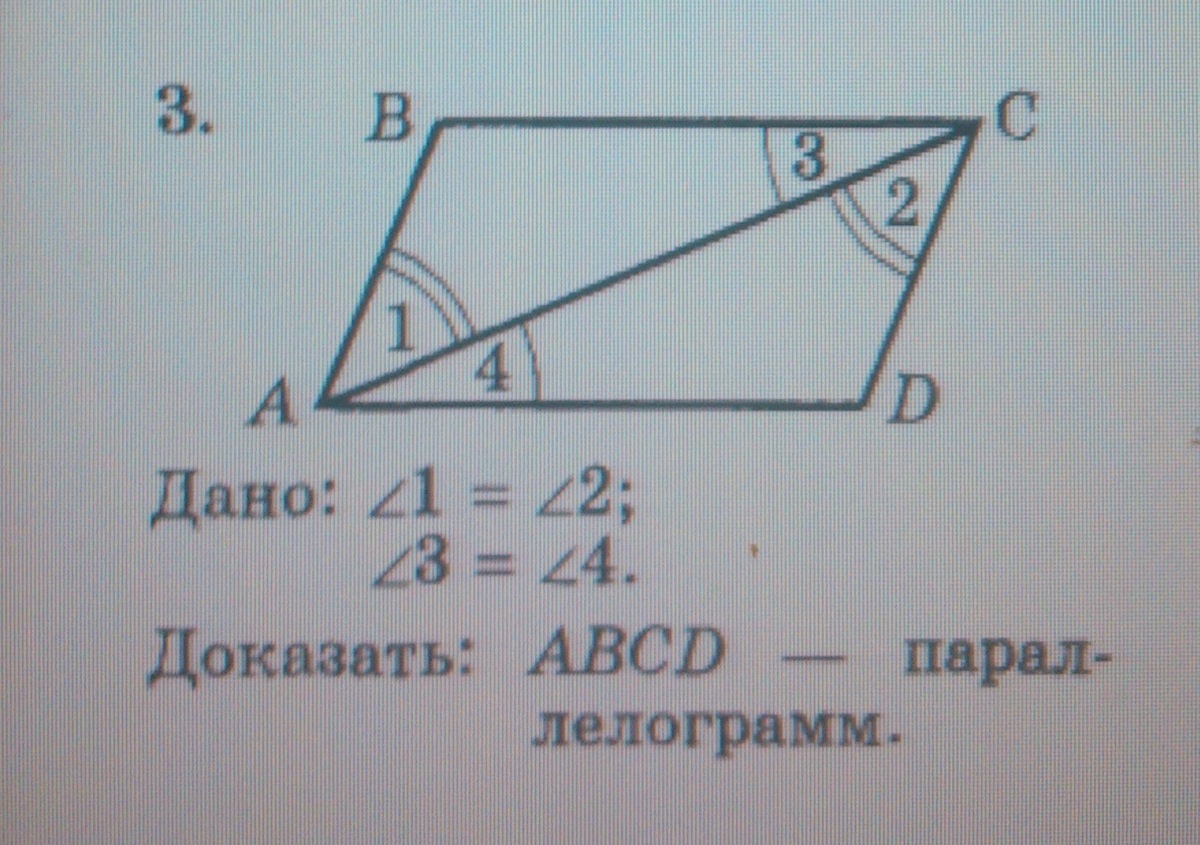 3) Углы ВСА и САD равны как накрест лежащие. Значит треугольники АВС и ACD равны по 2 признаку, значит, все элементы в них соответственно равны. Значит, это параллелограмм, тат как противоположные стороны у него попарно равны.