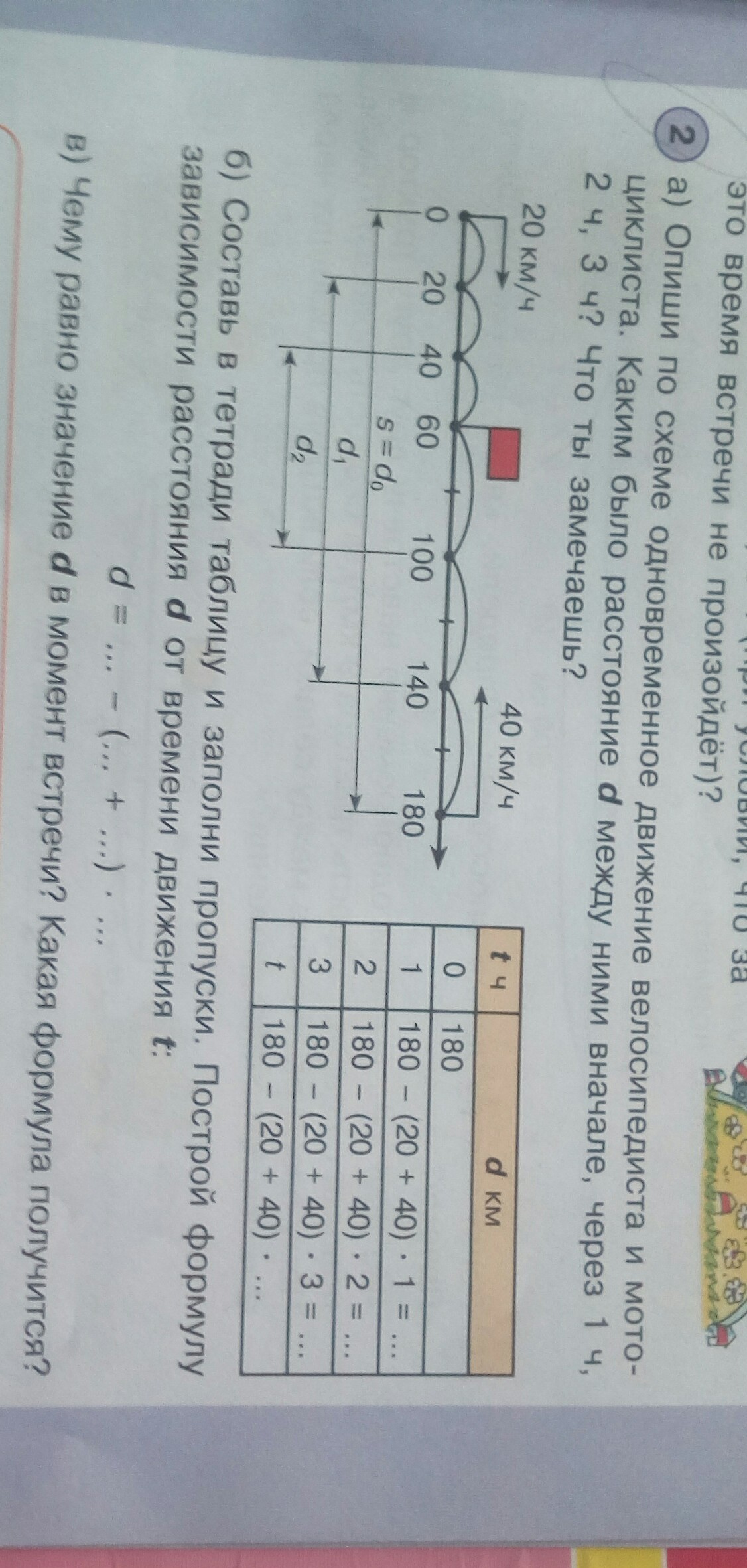 опиши по схеме одновременное движение вилосипидиста и мотоциклиста каким было расстояние d между ними вначале , через 1 час ,2 ч 3ч? что ты замечаешь?
