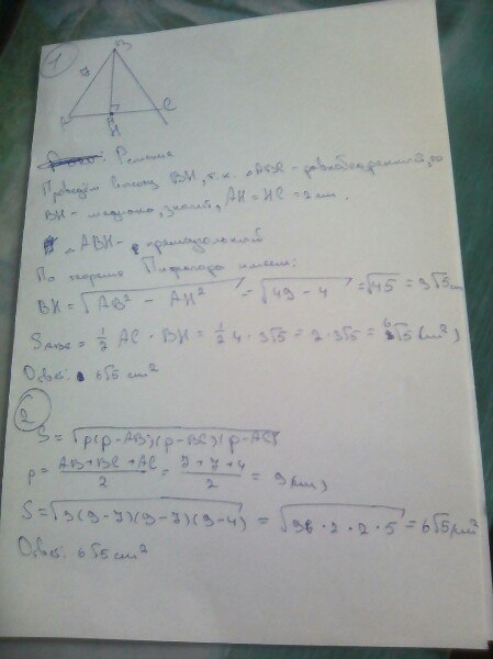 Найдите площадь равнобереденного треугольника, если боковая сторона равна 7 см, а основание 4 см