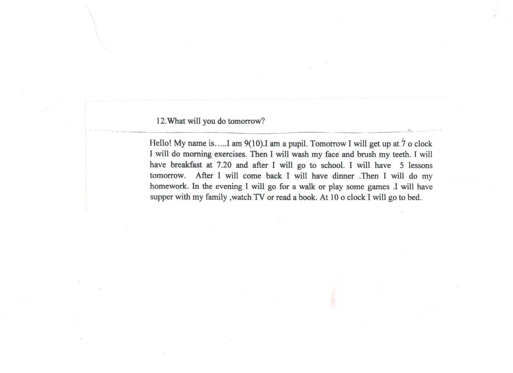 хеллоу, мой нейм из.... ай эм найн (тэн) ай эм из папил. томороу ай вилл гет ап эт сэвэн о клок. ай вилл ду монингэксерентиз. вен ай вилл вош май фэйс энд враш май тиф. ай вил хэв брекфаст эт 7.20 энд афтэр ай вил гоу ту скул. ай вил хэв файв лессонс. томороу. афтэр ай вил кам бэк ай вил хэв диннэ. вен ай ду май хамвёрк. ин зе ивнин ай вилл гоу э волк о плэй сам геймз. ай вилл хэв суппэ вив май фэмили, воч ТИВИ о рид э бук. эт тен о клок ай вилл гоу ту бэд