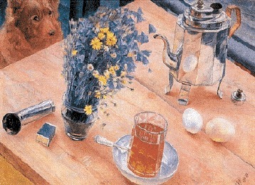 На большей части картины изображён деревянный стол. На картине видно, что в тот момент был день и светило солнце. На самом столе стоит самовар на гнутых ножках. Самовар отражает белое яйцо. Рядом лежит ещё одно яйцо, но только уже золотистого цвета. Возле самовара стоит в баночке букет полевых цветов. Рядом с ними стоит блюдце чай в граненом стакане с ложечкой . Ещё рядом с вазой видны фонарик и коробок со спичками. Они находятся в углу стола. На заднем плане картины сидит собака, которая смотрит в даль.