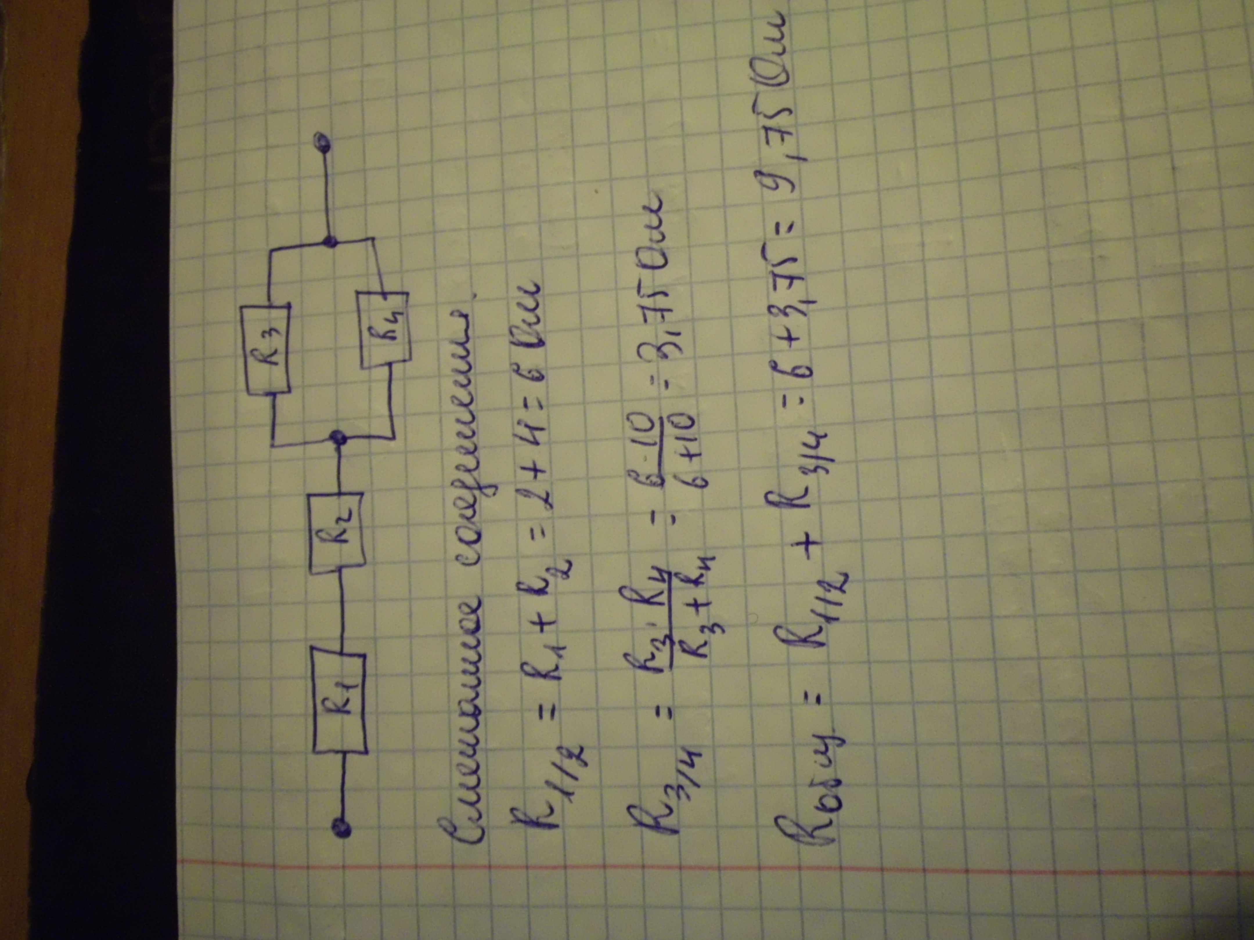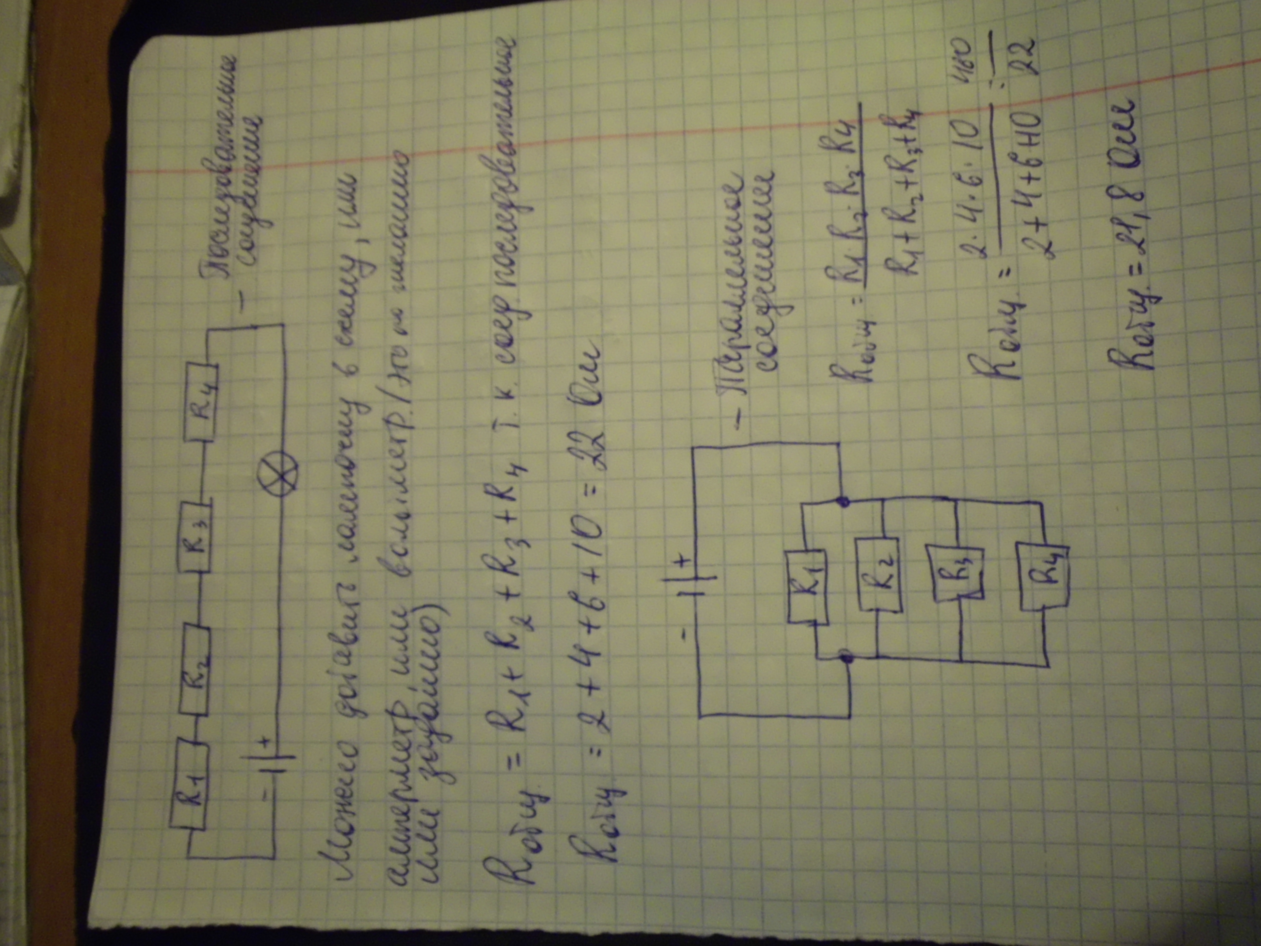 Начертить все возможные схемы соединения 4 проводников сопротивлением 2Ом, 4Ом, 6Ом, 10Ом. Найти общее сопротивление.