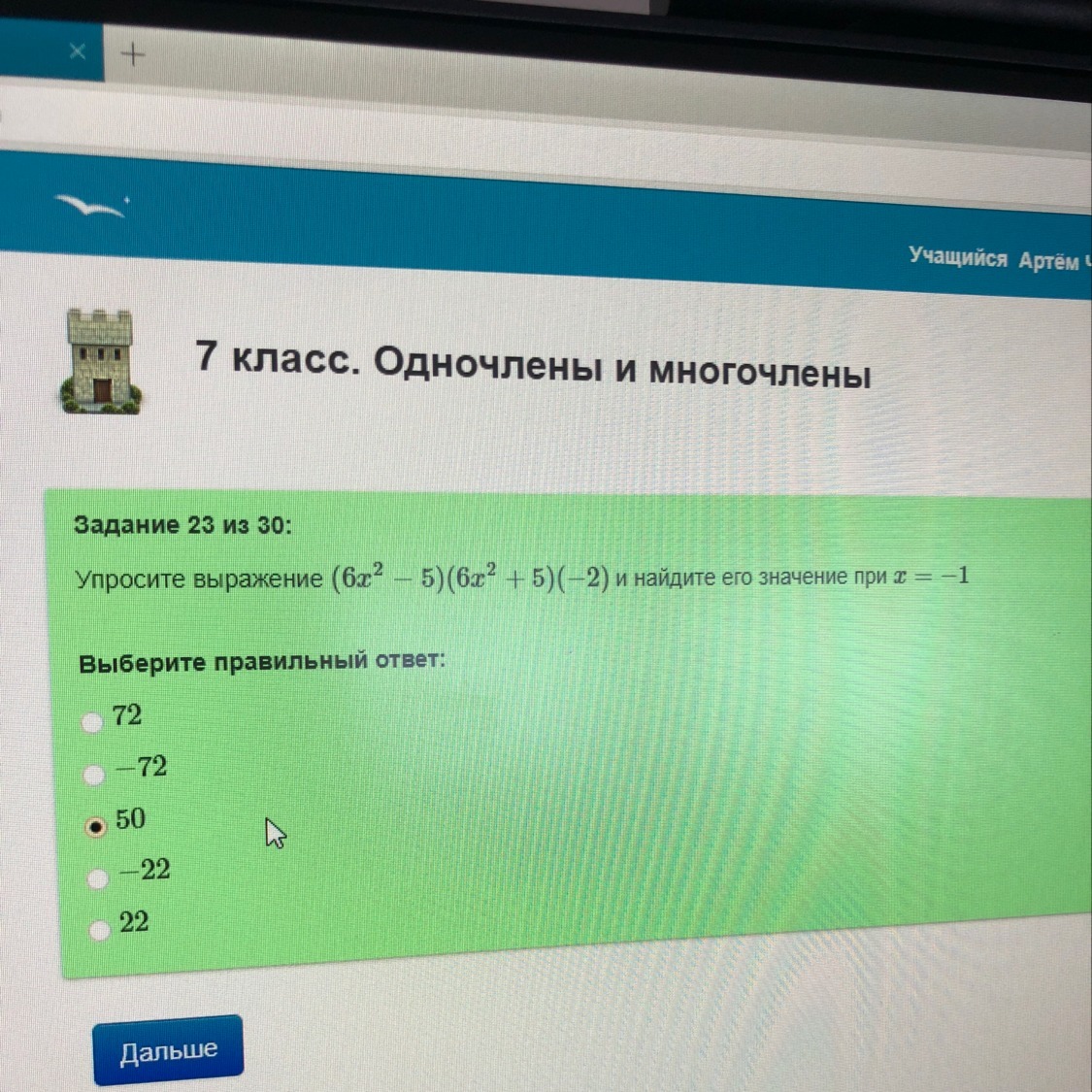 50 - 72х⁴ = 50 - 72(-1)⁴ = 50 - 72 = -22