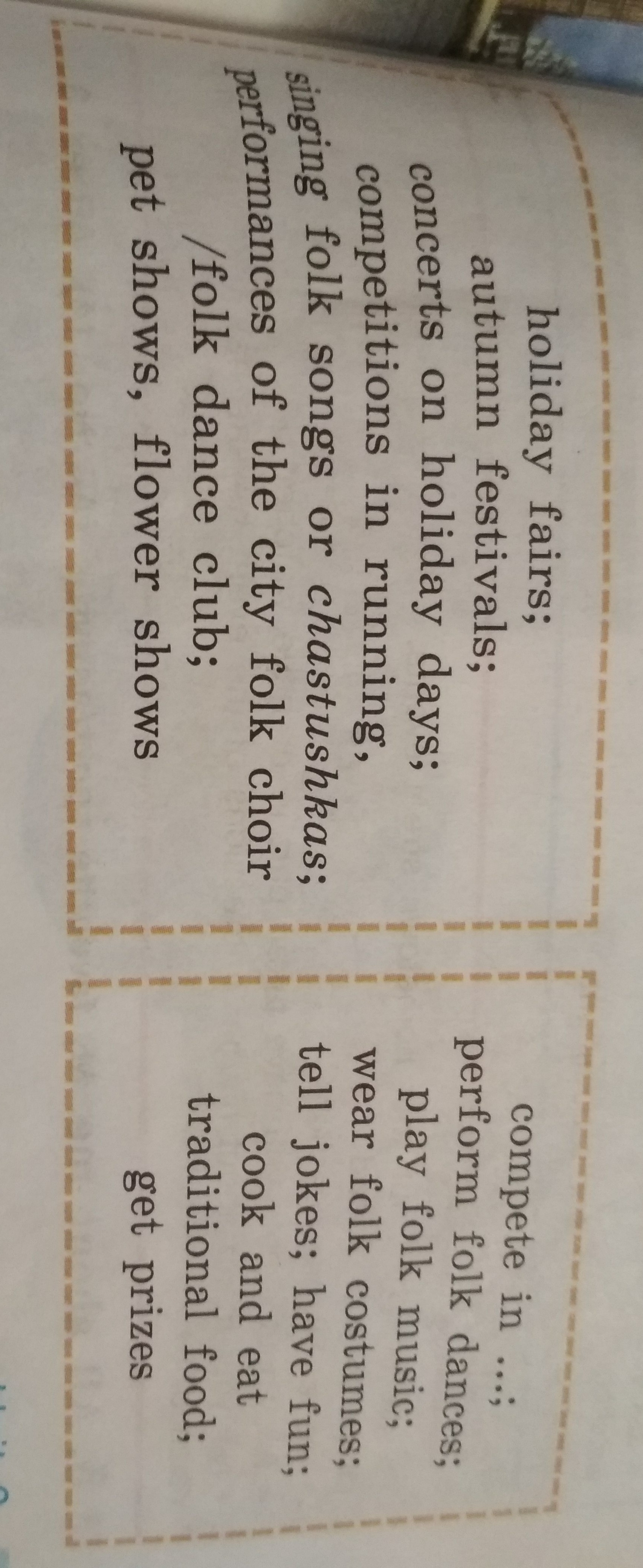 1. Праздничные ярмарки, 2 осенние праздники, 3 концерты в праздничные дни, 4 соревнования в беге, 5 пение народных песен или частушек, 6 выступление городского народного хора/ народного танцевального клуба, 7 выставка животных ,выставка цветов, 8 конкурировать в...., 9 исполнять народные танцы, 10 играть народную музыку, 11 носить народные костюмы, 12 рассказывать анекдоты: весело:, 13 приготовить и есть, 14 традиционные блюда, 15 получить призы.