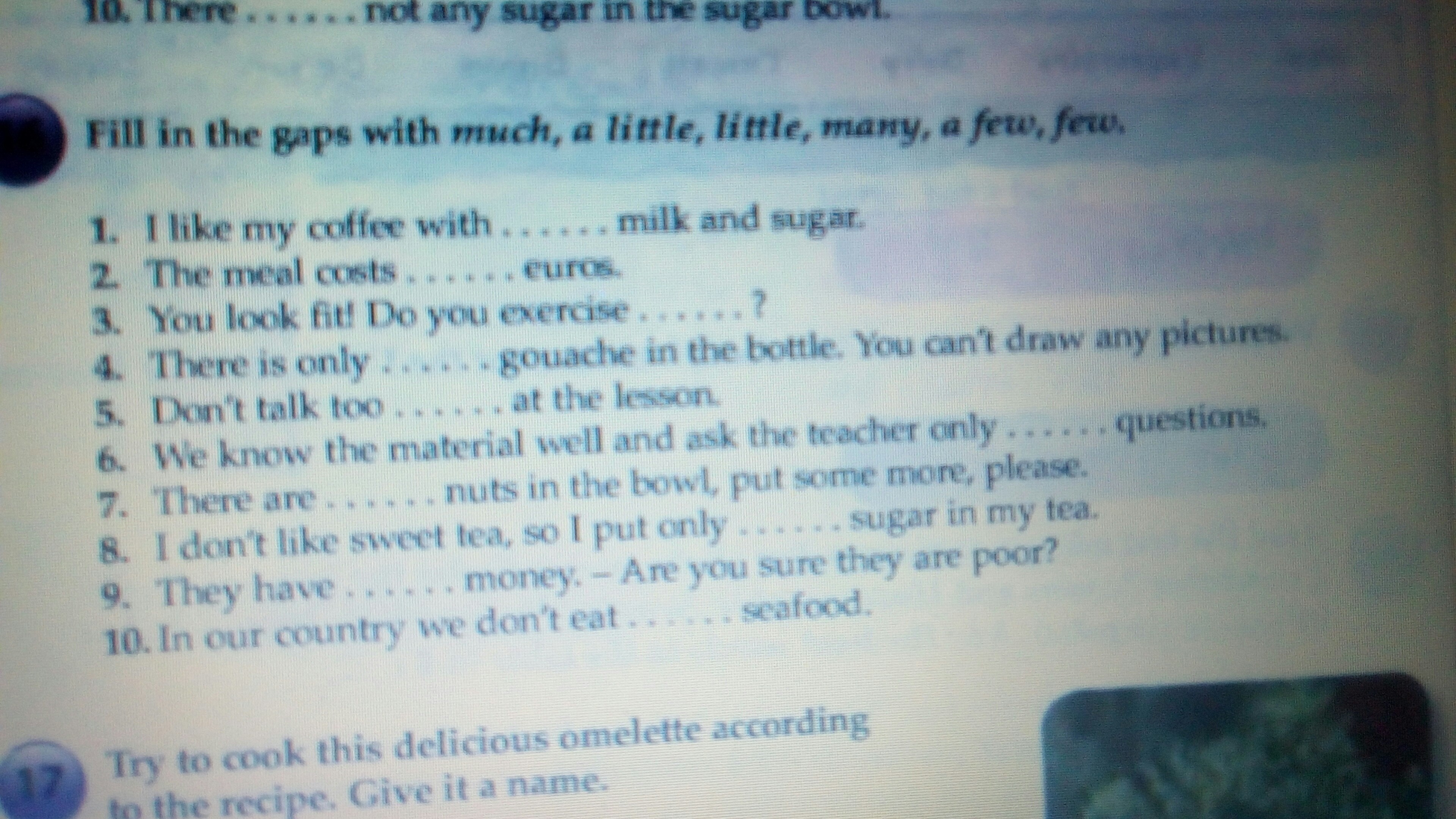 1. much 2. many 3. much 4. little 5. much 6. a few 7. few 8. a little 9.little 10. much.