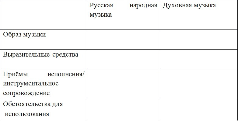 Помогите составить сравнительную таблицу русской народной и духовной музыки