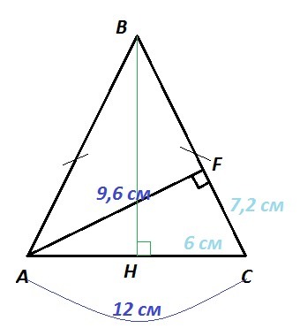 ΔABC - равнобедренный, AB=BC; AF⊥BC; AC=12 см; AF=9,6 см
