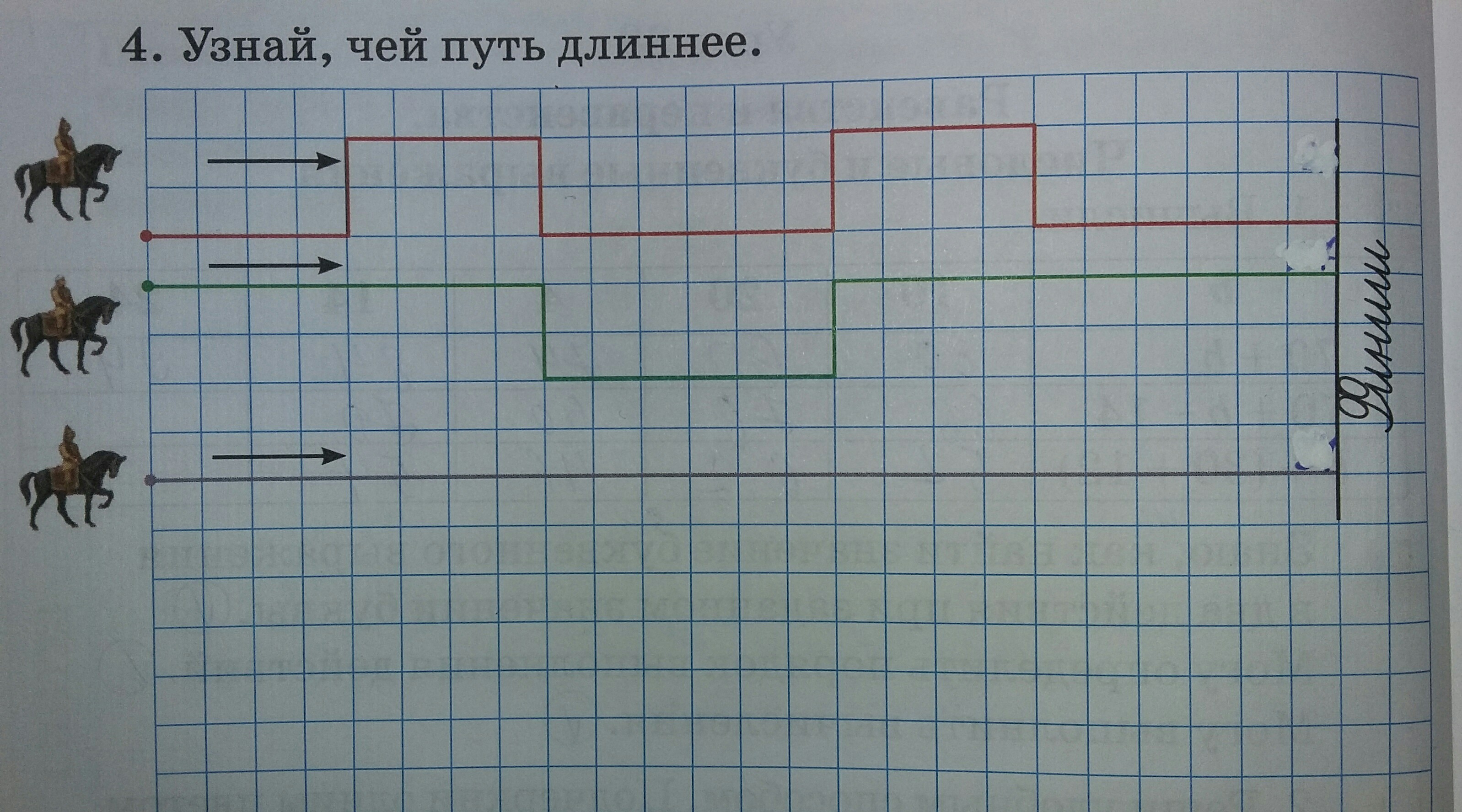 1 лошади, потому что путь состоит из 34 клеточек, у второй из 28 клеточек, а у третьей из 24 клеточек
