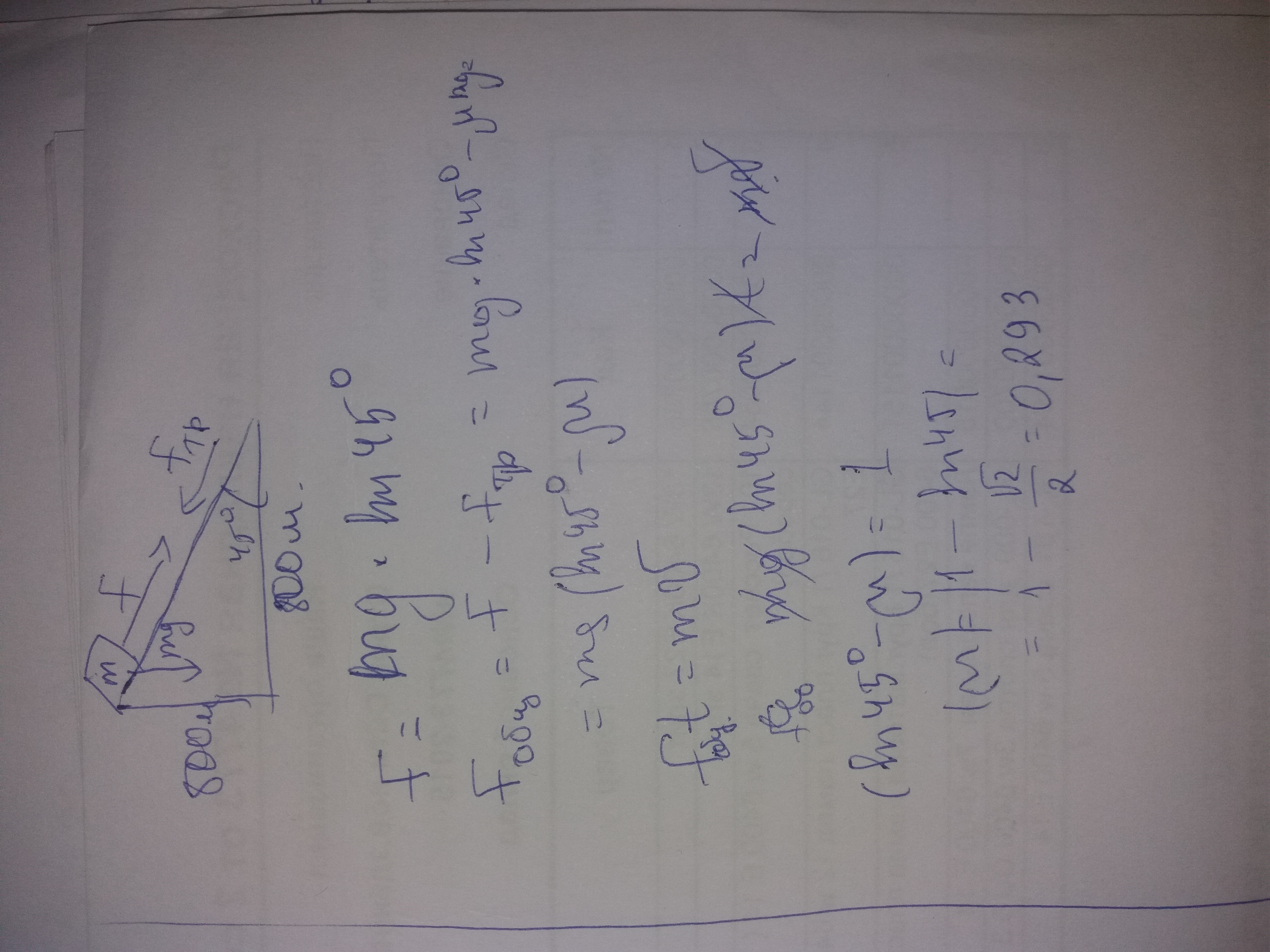 Тело из состояния покоя соскальзывает с вершины наклонной плоскости высотой 800 см и углом наклона 45 градусов за 1/30 мин. Определить коэффициент трения между телом и поверхностью.