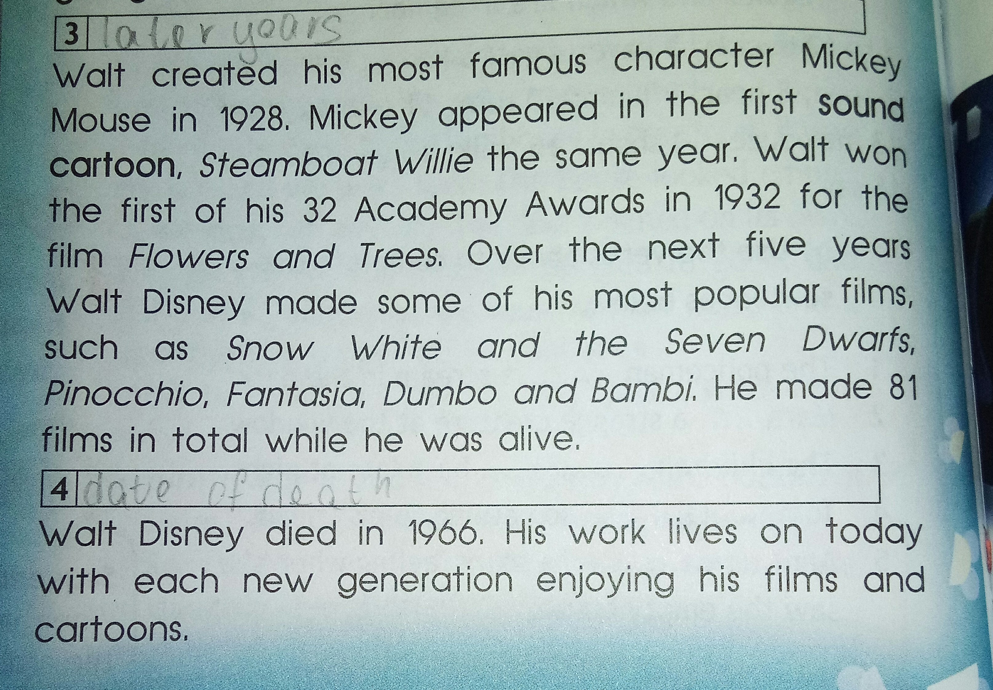 Уолт создал его самого известного персонажа Микки Мауса в 1928. Микки появился в первом музыкальном мультфильме, Стимбоут Вилли (переведи сам) в том же году. Уолт выиграл первую из его 32 Академических наград в 1932 за фильм Цветы и деревья. Следующие пять лет Уолт Дисней сделал некоторые из его самых популярных фильмов, такие как Белоснежка и семеро гномоа, Пиноккио, Фантазия, Дамбо и Бэмби. За всю его жизнь он сделал 81 фильм.