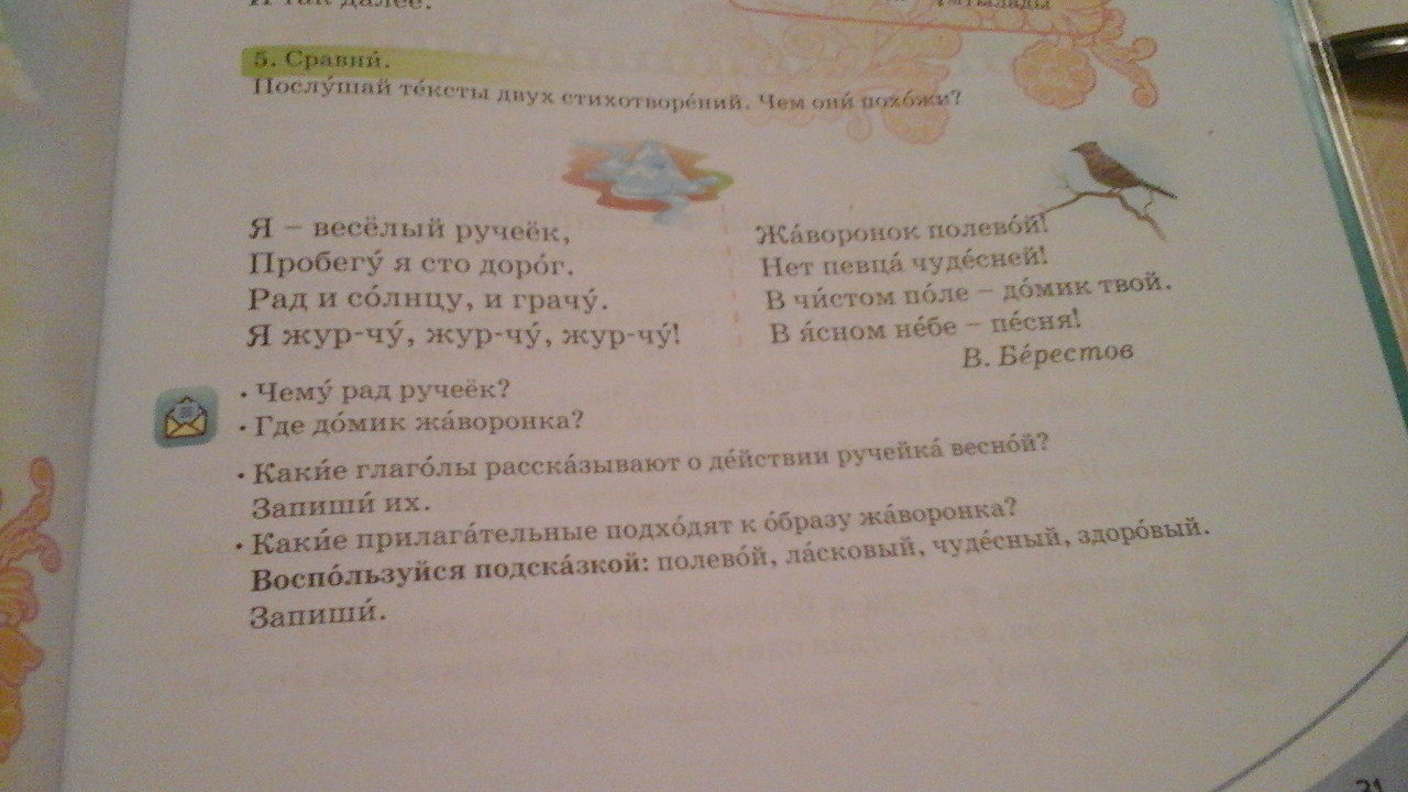 1 вопрос Ручеёк рад солнцу и грачу. 2 вопрос Домик грача - в чистом поле. 3 вопрос Пробегу рад и жур-чу жур-чу жур-чу. 4 вопрос Полевой чудесный ласковый и здоровый. Также можете в 4 вопросе пользоваться подсказкой . Эти подсказки относятся ко 2 стиху про жаворонка прилагательные . Например полевой чудесный ласковый и здоровый...