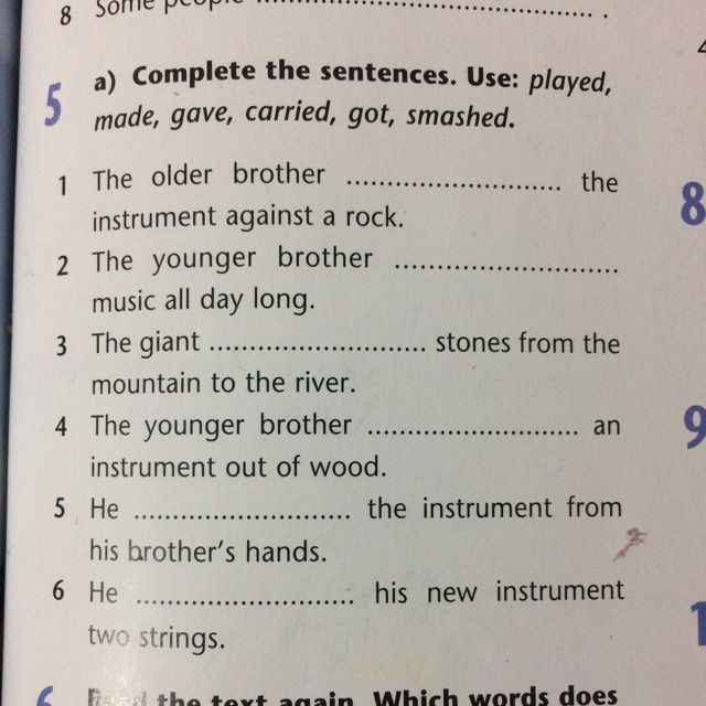 1. smashed 2.played.3.carried4.made5. got6.give