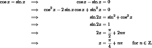 А можно было ещё проще,зная значения в которых синус равен косинусу определить что это p/4+pn