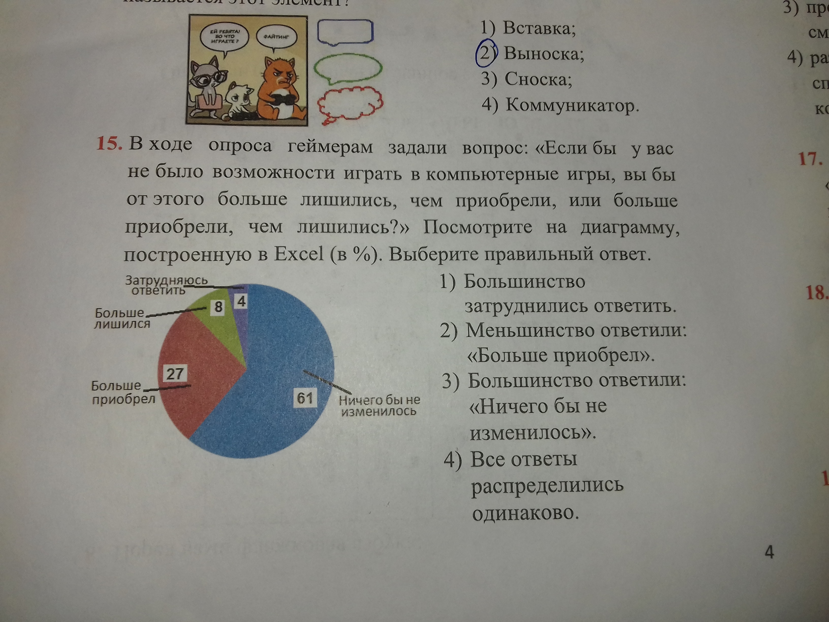 1 неверно,так как 4% это меньшинство.27% наоборот большинство, поэтому 2 тоже неверно. 4 неверно,так как делилось не по 25% в каждом.3 верно,так как 61% самое большое,поэтому за "ничего бы не изменилось" ответило большинство