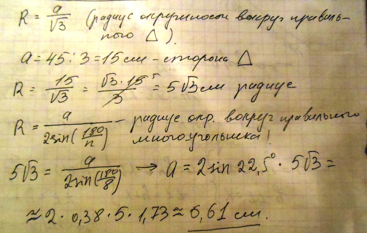 периметр правтльного треугольника, вписанного в окружность, равен 45 см. Найдитетсторону правильного восмиугольника, вписаного в ту же окружность