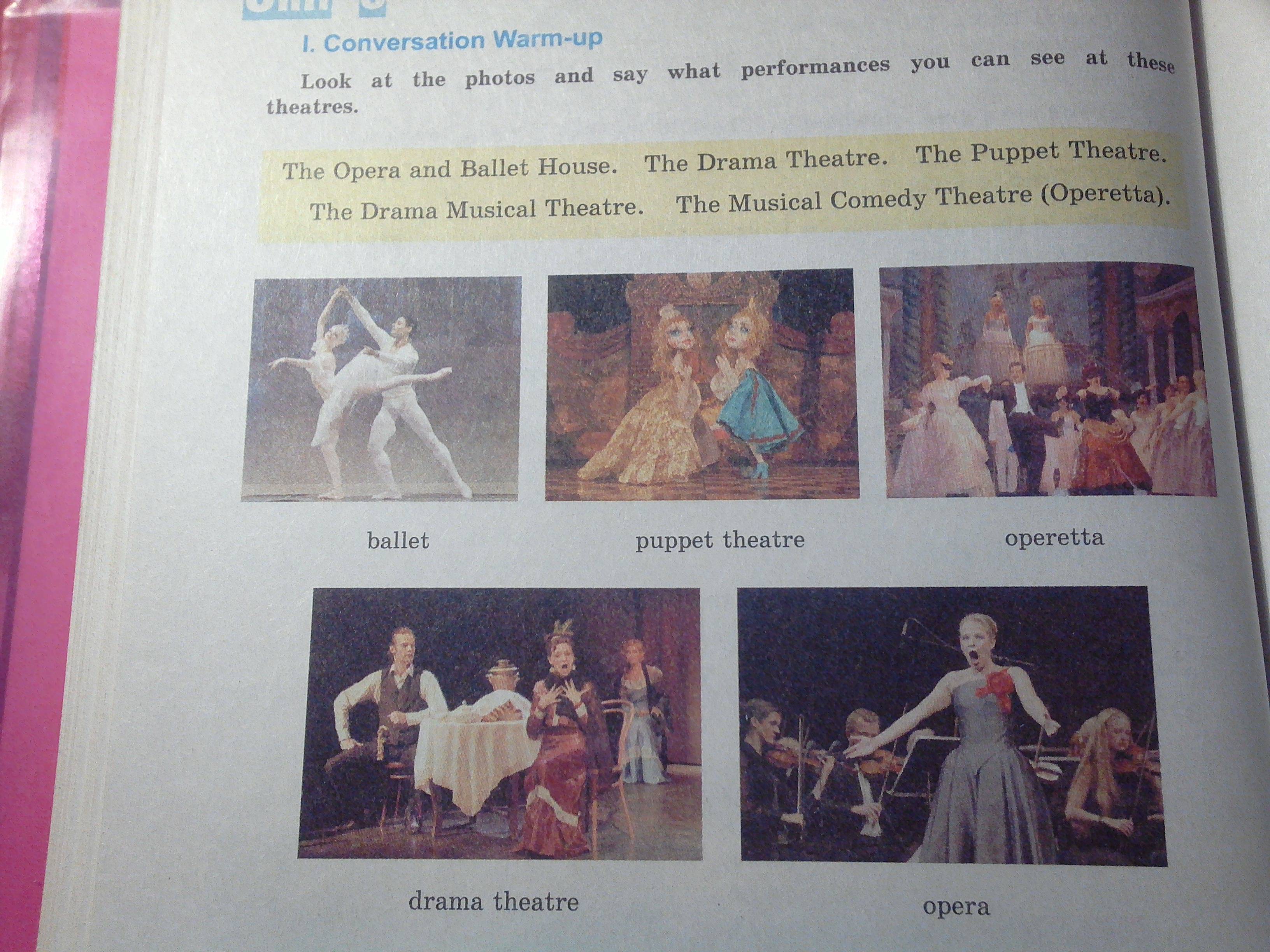 I can see a ballet in The opera and Ballet house, a drama in The Drama Theatre, a puppet in The Puppet Theatre, an operetta in The Musical Comedy Theatre, an opera in The Musical Drama Theatre