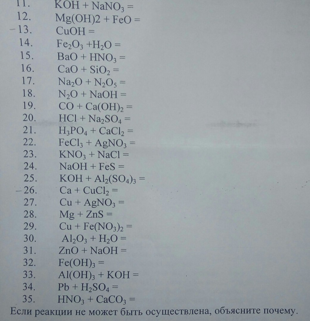 11 реакция ионного обмена идёт до конца, если в результате получается газ, вода или осадок . В 11 ничего этого нет, значит реакция не идёт. 12 невозможна потому, что нерастворимые основания не реагируют с основными оксидами. 13 в принципе возможно разложение нерастворимого основания 2CuOH= Cu2O+H2O , но ионного уравнения здесь не будет , так как ничто из компонентов не является электролитом. 14 не реагируют, только оксиды активных щелочных металлов реагируют с водой, а Fe к ним не относится.15: BaO+2HNO3= Ba(NO3)2+ H2O , ионное: BaO+2Hс плюсом +2NO3с минусом=Ba2с плюсом+2NO3 с минусом+H2O. 2 NO3 зачеркнуть с правой и с Лёвой стороны уравнения и записать, что осталось как сокращённое ионное. 16: CaO+SiO2= CaSiO3, ионного не будет, это не электролиты.17: Na2O+N2O5=2NaNO3 , Na2O+N2O5=2Na с плюсом+ 2NO3с минусом. 18 и 19 реакции не будет, эти оксиды несолетворные и солей образовывать не могут.20 реакция ионного обмена до конца не идёт, нет ни газа, ни осадка, ни воды.2H3PO4+3CaCl2=Ca3(PO4)2осадок+6HCl ; ионное:6Hс плюсом+2PO4 три с минусом+3Ca два с плюсом+6Cl с минусом=Ca3(PO4)2 осадок+6H с плюсом +6 Сl с минусом. Там, где осадок ставим стрелку вниз головой, у меня в планшете нет этого ничего, поэтому пишу словами. Зачеркиваем справа в уравнении и слева одинаковые Ионы, кроме осадка. Зачеркиваем. 6H с плюсом и 6 Cl с минусом. Получается сокращённое ионно уравнение:2PO4 3 c минусом+3Ca 2 с плюсом= Ca3(PO4)2 осадок.22: FeCl3+ 3AgNO3= Fe(NO3)3 +3 AgCl осадок; ионное: Fe три с плюсом+3Cl с минусом+ 3Ag с плюсом+ 3NO3 с минусом= Fe три с плюсом+3NO3 с минусом+ 3AgCl осадок. Зачеркиваем с обеих сторон Fe три с плюсом и 3NO3 с минусом. Записываем сокращённое иконное уравнение: 3Ag с плюсом+ 3Cl с минусом= 3 AgCl осадок ,стрелочка вниз.23 : ореакция не идёт до конца по тем же причинам, что и другие ионные: нет ни газа, ни осадка, ни воды. 24: 2NaOH+FeS=Na2S+Fe(OH)2 осадок. Ионное: 2Na с плюсом+2 OH с минусом+ FeS= 2Na c плюсом +S два с минусом+Fe(OH)2 осадок. Зачеркиваем с обеих сторон уравнения 2Na с плюсом, оставшееся переписываем как сокращённое ионное уравнение. К сожалению не отсею больше времени, скажу , что29 и 30 реакции невозможны, остальные пишите сами . Спасибо за внимание.