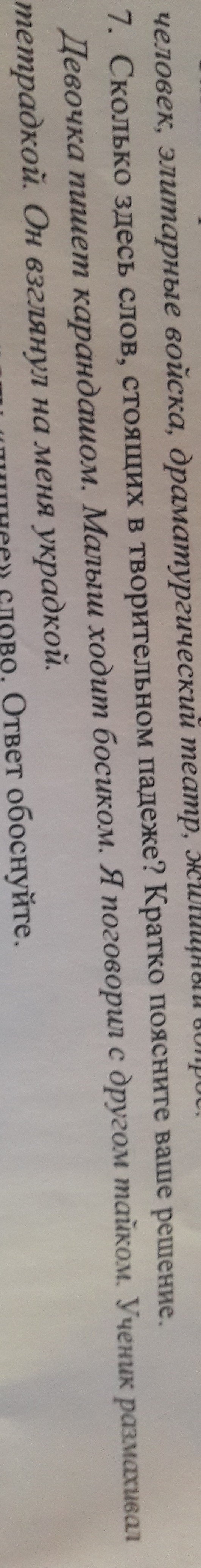 сколько здесь слов, стоящих в творительном падеже? слова: Девочка пишет карандашом, малыш ходит босиком, я поговорил с другом тайком, ученик размахивал тетрадкой, он взглянул на меня с украдкой