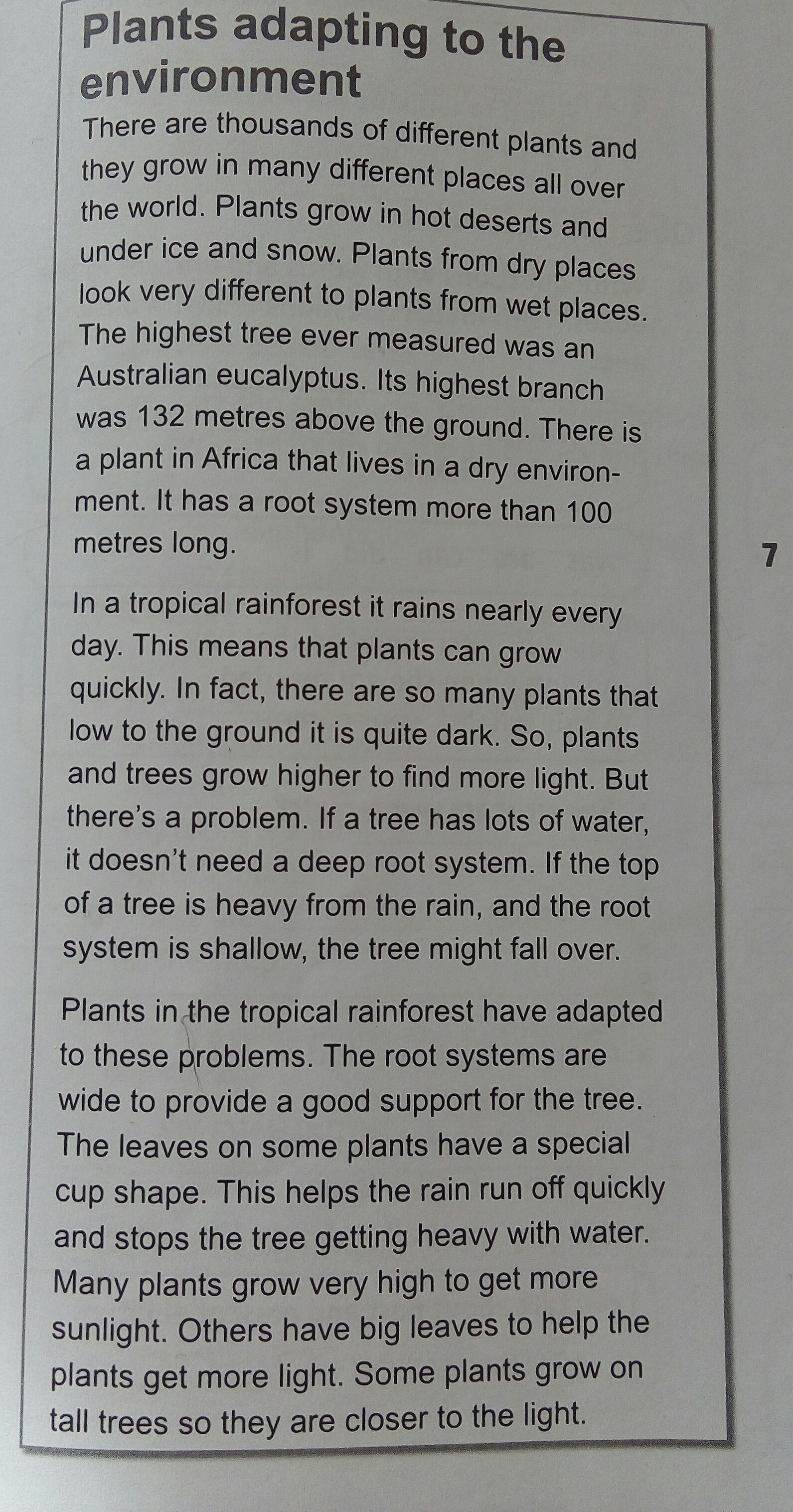 Растения адаптируются кокружающая средаТысячи различных заводов иони растут в разных местах повсюдумир. Растения растут в жарких пустынях ипод льдом и снегом. Растения из сухих мествыглядят очень разные растения из влажных мест.Самым высоким когда-либо измеренным деревом былоАвстралийский эвкалипт. Его Высшая ветвьбыло 132 метра над землей. Естьрастение в Африке, которое живет в сухой окружающей среде-мужчины, его корневая система более 10метров длиной.В тропическом лесу дождь идет почти каждыйдень. Это означает, что растения могут растибыстро. На самом деле, есть так много растений, которыенизко до земли довольно темно. Итак, растенияи деревья растут выше, чтобы найти больше света. Ноесть проблема. Если на дереве много воды,ему не нужна глубокая корневая система. Если верхдерева тяжелое от дождя, а кореньсистема неглубокая, дерево может упасть.Растения в тропических лесах адаптировалиськ этим проблемам. Корневые системыширокий, чтобы обеспечить хорошую поддержку для дерева.Листья на некоторых растениях имеют особыйформа чашки. Это помогает дождю побежать быстрои останавливает дерево становится тяжелым с водой.Многие растения растут очень высоко, чтобы получить большесолнечный свет. Другие имеют большие листья для того чтобы помочьрастения получают больше света. Некоторые растения растут дальшевысокие деревья так они ближе к свету.