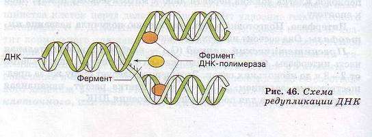 Молекула ДНК состоит из двух цепочек нуклеотидов, соединенных водородной связью. Специальный фермент Геликаза (или хеликаза) разрушает связи между нуклеотидами . Две цепи расходятся, им не дают слипнуться специальные белки-агенты ssb. Из одной материнской молекулы синтезируются две дочерние с помощью фермента ДНК-полимеразы. Процесс репликации (удвоения ДНК) происходит не сразу по всей длине молекулы, а только на участках - репликационных вилках.