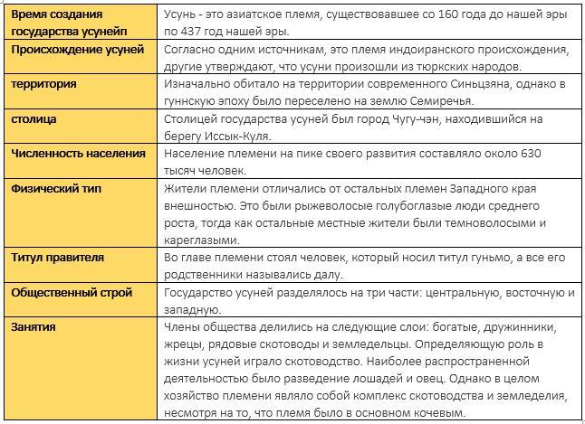 Таблицу История и хозяйство усуней можно заполнить так