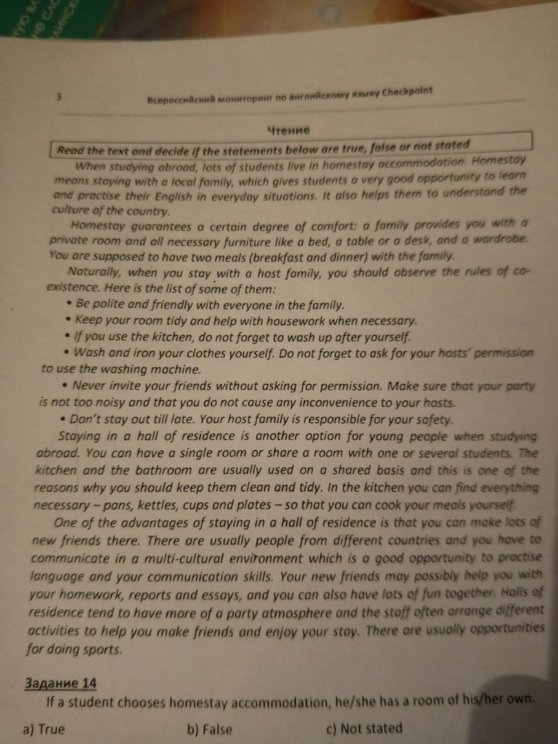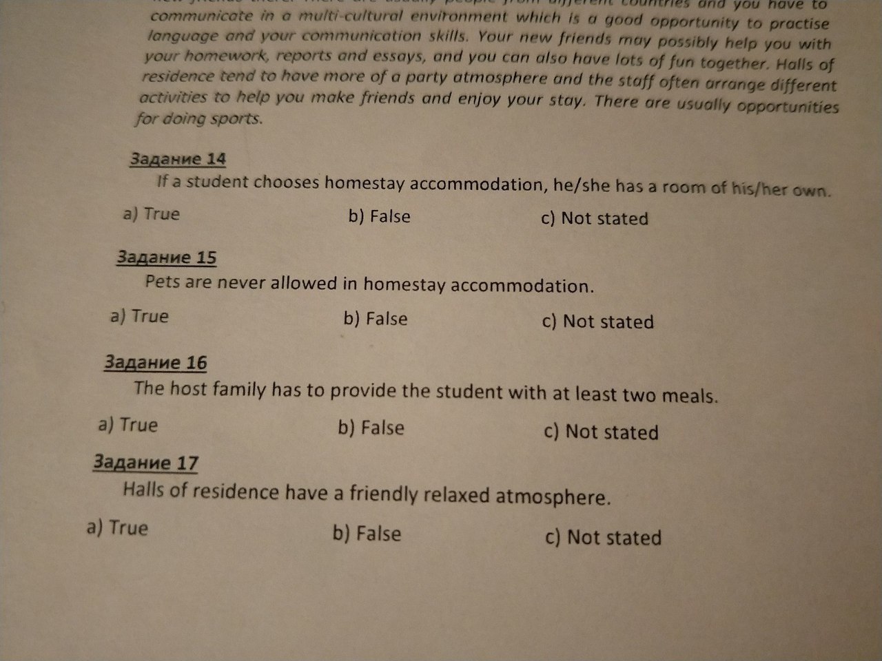 14a (a family provides you with a private room) 15c 16a (you are supposed to have two meals with the family) 17a (Halls of residence tend to have more of a party atmosphere)