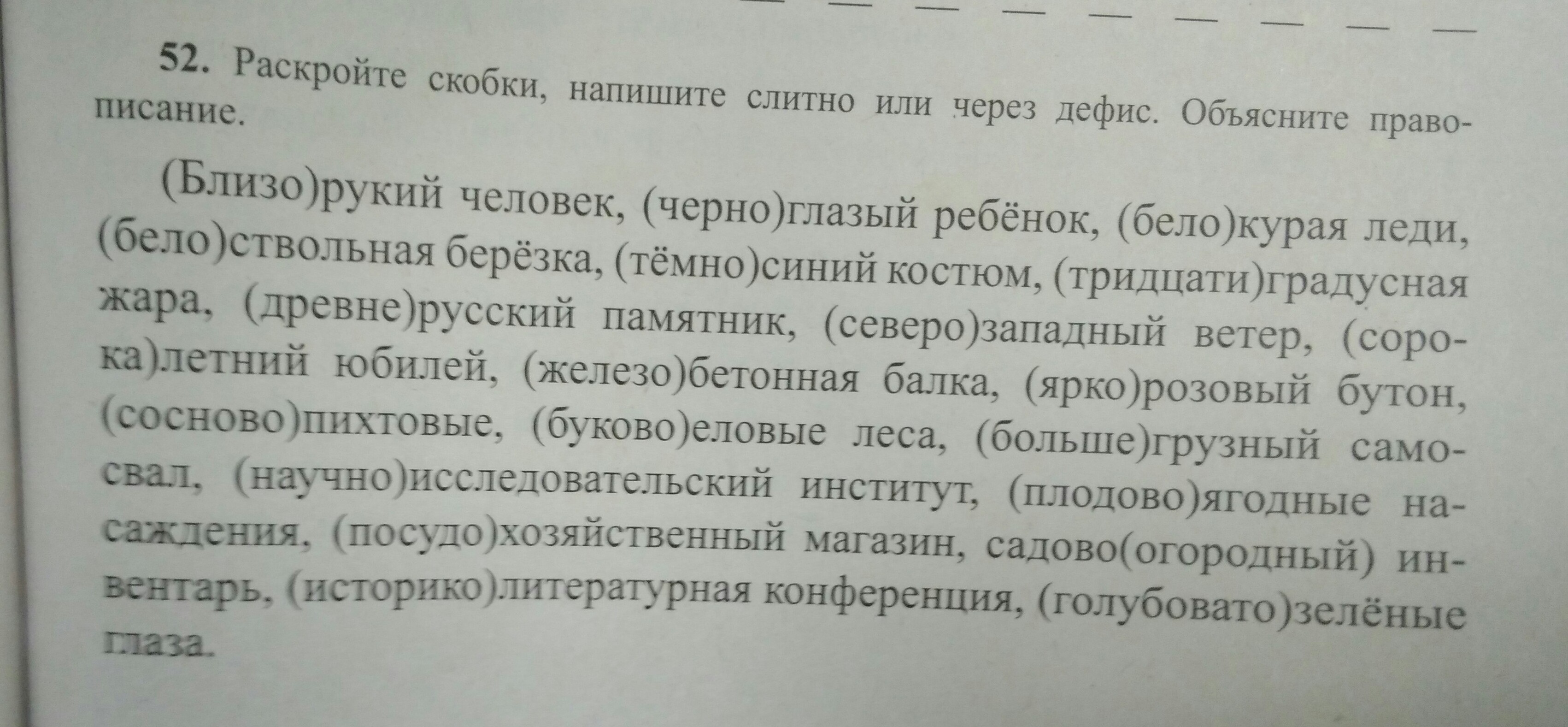 близорукий,черноглазый,белокурая,белоствольная,темно-синий,тридцатиградусная,древнерусский,северо-западный,сорокалетний,железобетонная, ярко-розовый,сосново-пихтовые,буково-еловые,большегрузный,научно-исследовательский,плодово-ягодные,посудо-хозяйственный,садово-огородный,историко-литературный,голубовато-зеленые