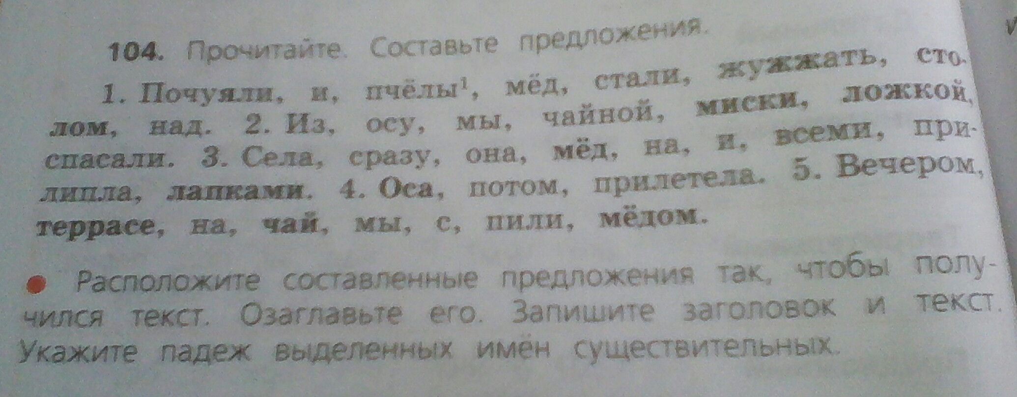 мёд (В.п.)над столом (Т.п.). миски (Р.п.)ложкой (Т.п) мёд (В.п.)лапками (Т.п.)оса (И.п.) террасе (П.п.) чай (В.п.)с мёдом (Т.п.)
