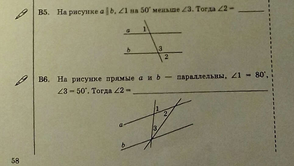 В5. Угол 3 -50=угол 1. Так как a||b, то угол 3+угол 1=180. Следовательно Угол 3=65. Угол 3 + угол 2=180. Угол 2=115.