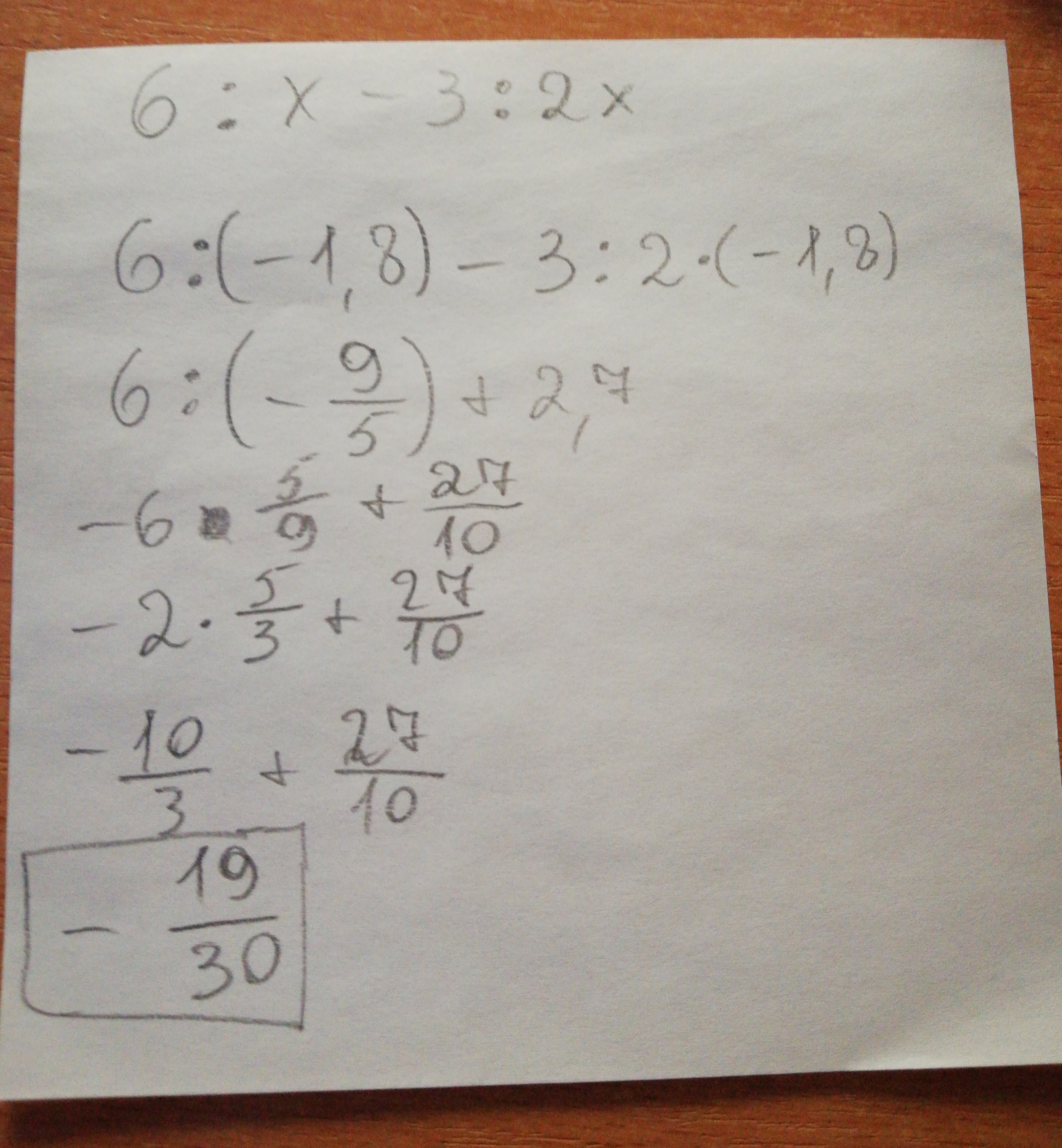 6/-1,8 - 3/2 • (-1,8) = 6/-9/5 - 3/2 • (-9/5) = -10 + 27/10 = -19/30