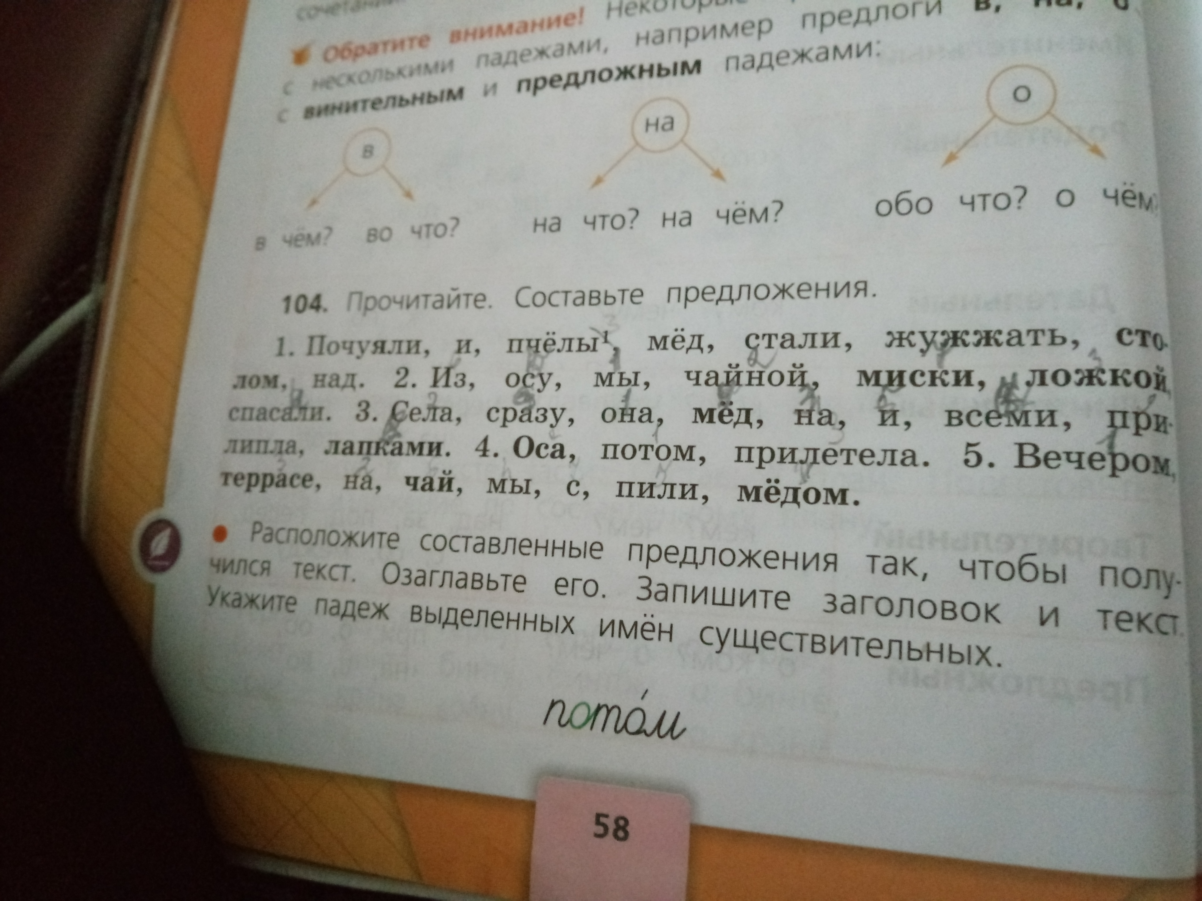 Пчелы почуяли мед и стали жужжать над столом(Т.п). Потом прилетела оса(И.п.). Села она на мед(В.п.) и сразу прилипла всеми лапками(Т.п.). Из миски(Р.п.) мы спасали осу чайной ложкой(Т.п.).