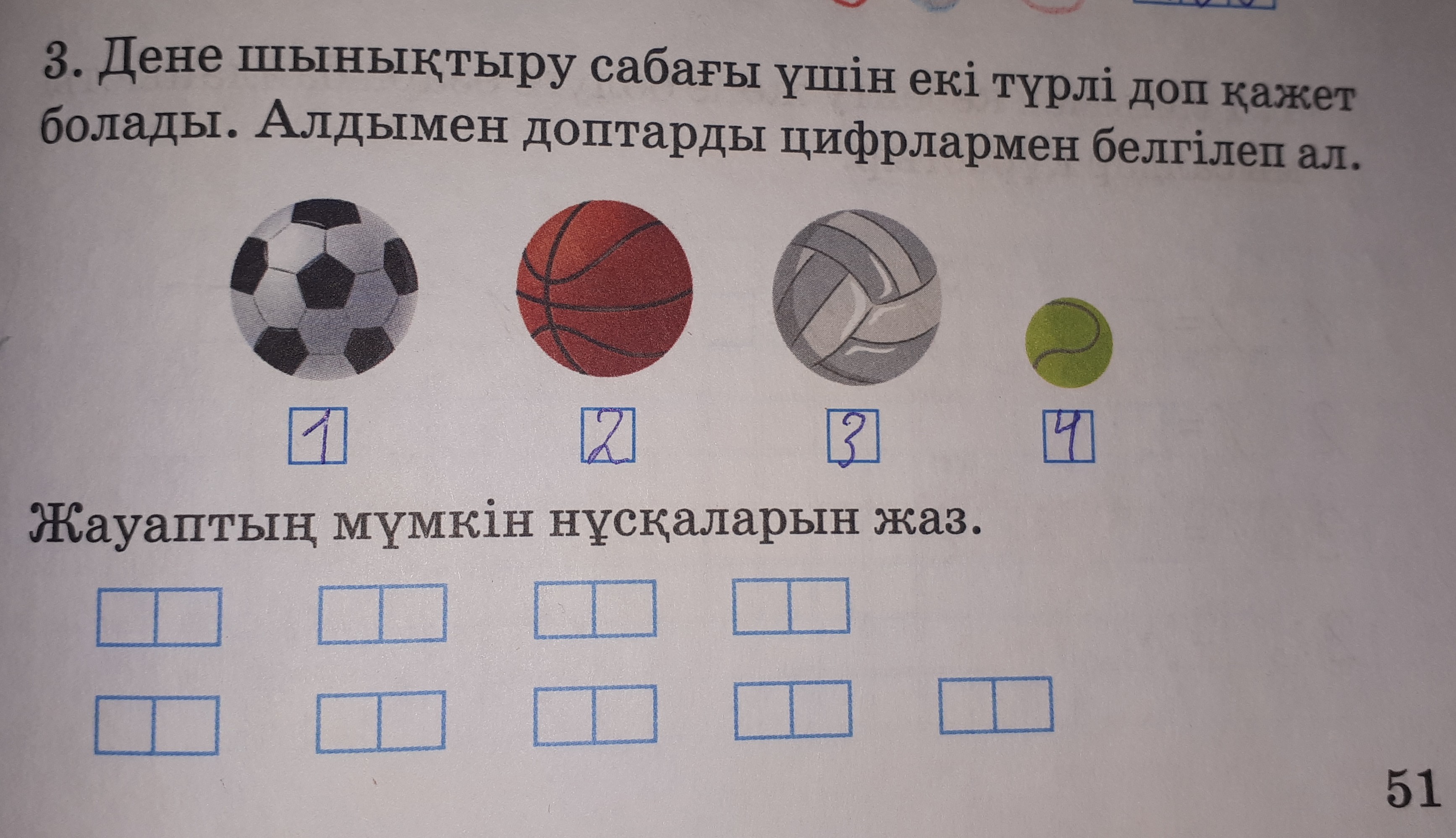 дене шыныктыру сабагы ушин 2 турли доп кажет болады. алдымен доптарды цифрамен белгилеп ал. Жауаптын мумкин нускаларын жаз.