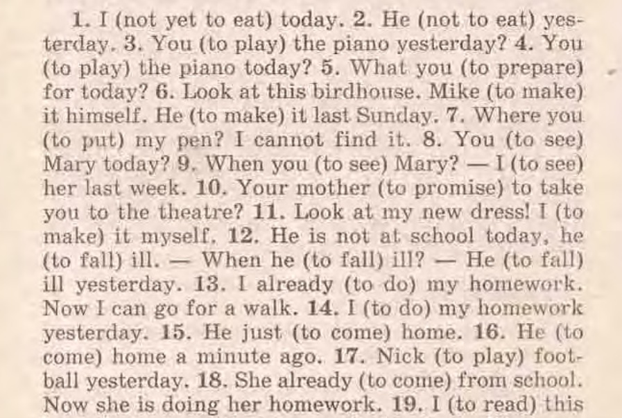 1. I (have not yet eaten) today. 2. He (did not eat) yesterday. 3. Did you (play) the piano yesterday? 4. Have you ( played) the piano today? 5. What have you prepared for today? 6. Look at this birdhouse. Mike has made) it himself. He made) it last Sunday. 7. Where have you put) my pen? I cannot find it. 8. Have you seen) Mary today? 9. When did you see) Mary? - I saw her last week. 10. Did your mother promise) to take you to the theatre? 11. Look at my new dress! I have made) it myself. 12. He is not at school today, he has fallen) ill. - When did he (fall) ill? - He fell) ill yesterday. 13. I have already done) my homework. Now I can go for a walk. 14. I did my homework yesterday. 15. Hehas just come) home. 16. He came) home a minute ago. 17. Nick played) football yesterday. 18. She has already come) from school. Now she is doing her homework.