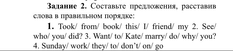 1 I took this book from my friend. 2 Who did you see? 3 Why do you want to marry Kate? 4 On Sunday they don't go to work.