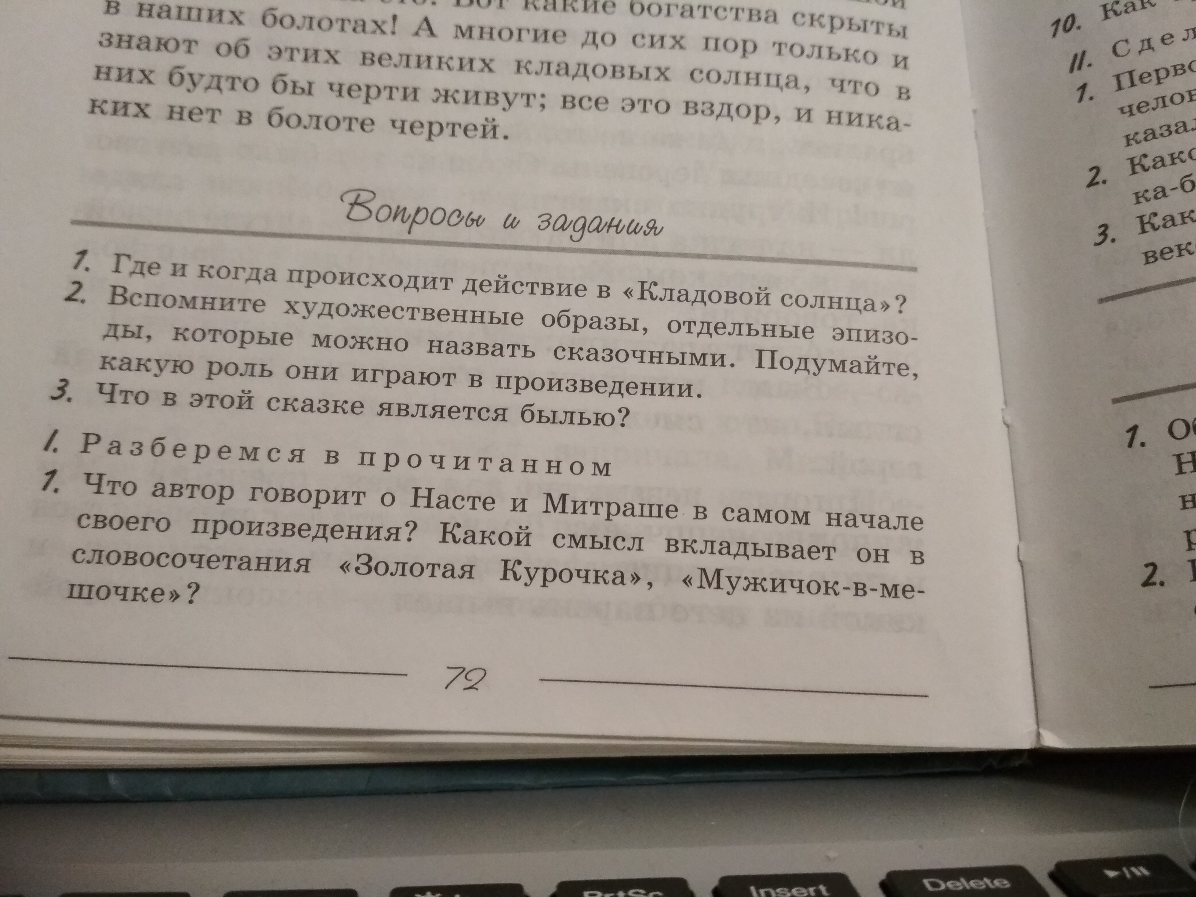 1)Действие сказки-были "Кладовая солнца" происходит в 1943г., во время Великой Отечественной войны. В одном селе, возле Блудова болота, в районе города Переславля-Залесского. Главные герои - двое детей-сирот, у которых от болезни умерла мама, а отец погиб на Отечественной войне.