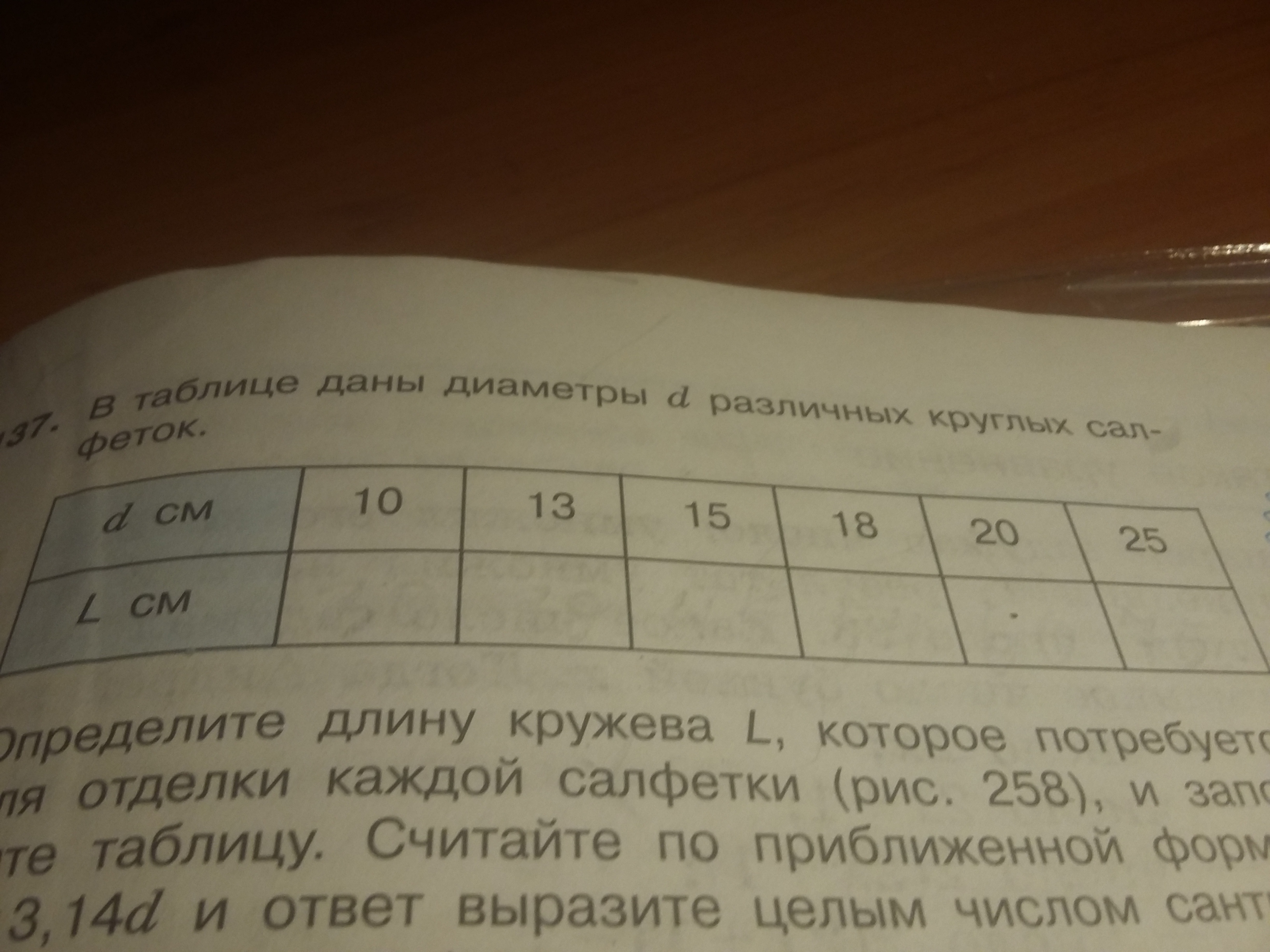 В таблице даны диаметры d различных круглых салфеток. Определите длину кружева l которое потребуется для отделки каждой салфетки (рис.258) и заполните таблицу. Считайте по приближенной формуле L~3,14d и ответ выразила целым числом сантиметров (с избытком).