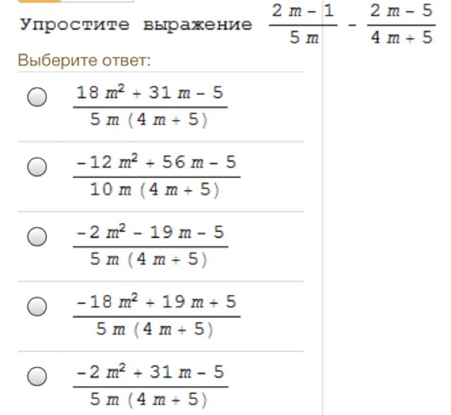 числитель равен: (2m-1)(4m+5) -(2m-5)5m=8m^2-4m+10m-5-(10m^2-25m)=8m^2+6m-5-10m^2+25m=-2m^2+31m-5