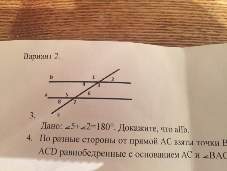 <4=<2 как вертикальные. По условию <5+<2=180 ,то <5+<4=180,а <5 и <4 внутренние односторонние. А раз сумма внутренних односторонних углов равна 180 град,значит а||b