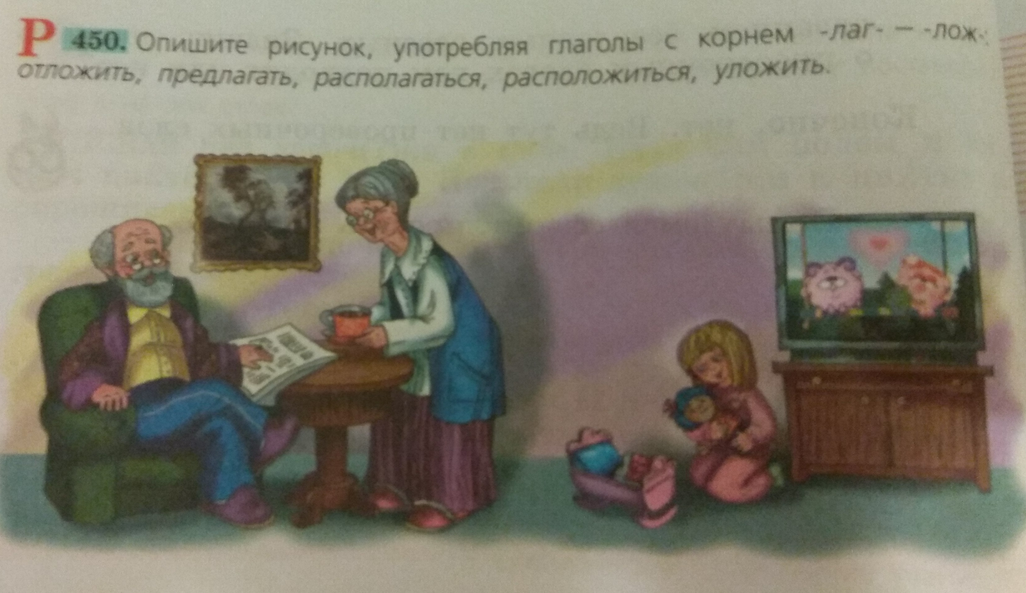 На данном рисунке мы видим девочку, которая по всей видимости приехала навестить дедушку с бабушкой. Девочка играет с куколкой, а на заднем плане по телевизору показывают мультик "Смешарики". Девочке весело в гостях у дедушки с бабушкой. Дедушка сидит в кресле, он расположился поудобнее и начинает читает новости, а бабушка предлагает ему попить немного чая, дедушка говорит пора уложить девочку спать. Бабушка согласилась.