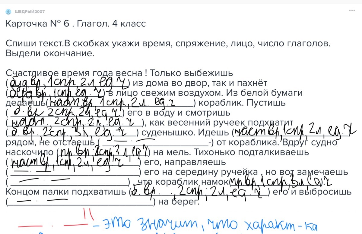 Счастливое время года весна ! Только выбежишь ( _____________________) из дома во двор, так и пахнёт (_________________) в лицо свежим воздухом. Из белой бумаги делаешь(__________________________) кораблик. Пустишь ( ____________________) его в воду и смотришь (________________________), как весенний ручеек подхватит (_______________________) суденышко. Идешь ( ____________________) рядом, не отстаешь ( ___________________-) от кораблика. Вдруг судно наскочило (________________) на мель. Тихонько подталкиваешь ( _______________________) его, направляешь ( _______________________) его на середину ручейка , но вот замечаешь ( _____________________) , что кораблик намок(________________). Концом палки подхватишь ( ________________________) его и выбросишь (__________________________) на берег.