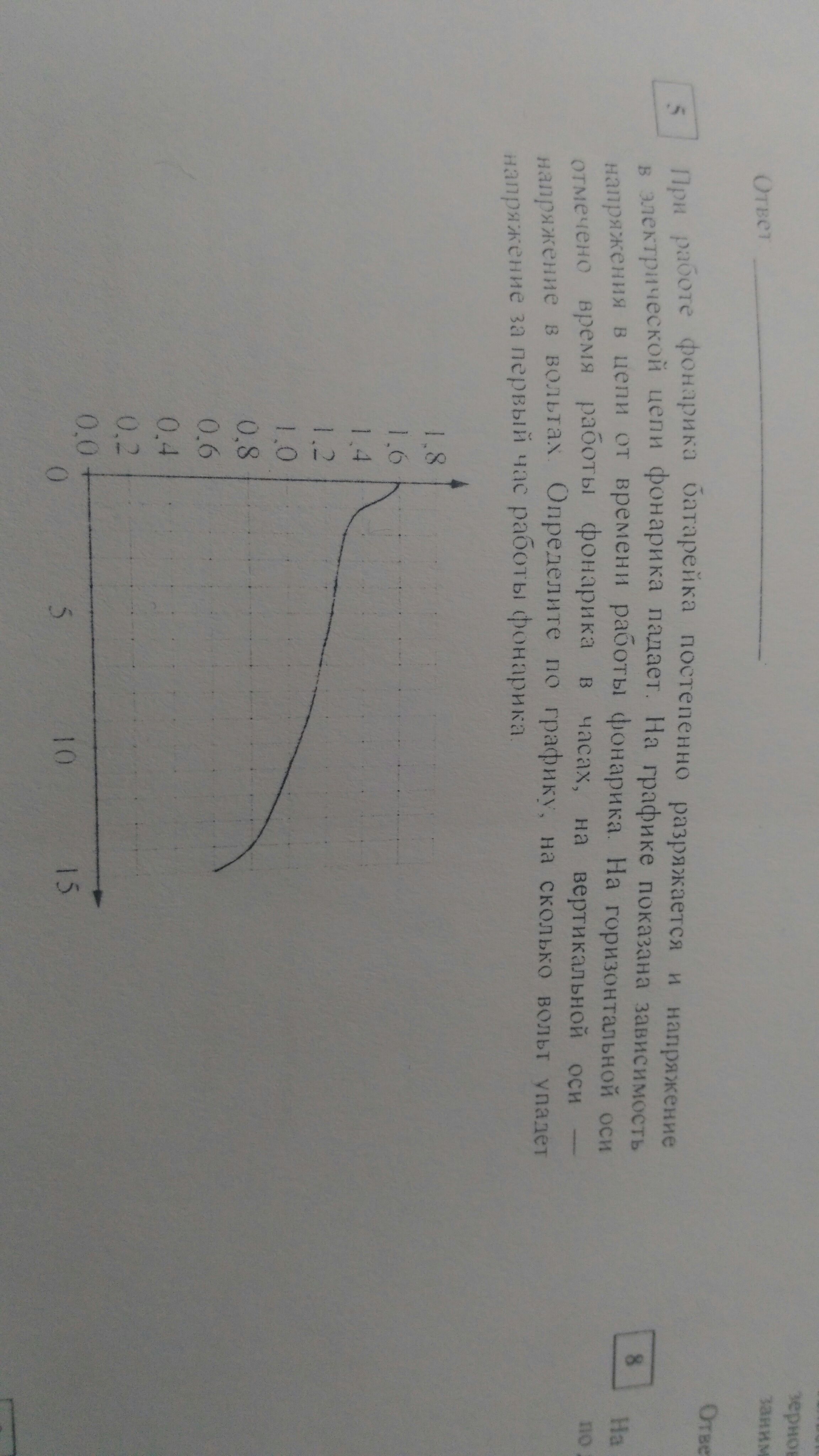 За первый час работы фонарика напряжение упало с 1,6 вольт до 1,4 вольт, т.е. оно упало на 1,6-1,4=0,2 вольт.