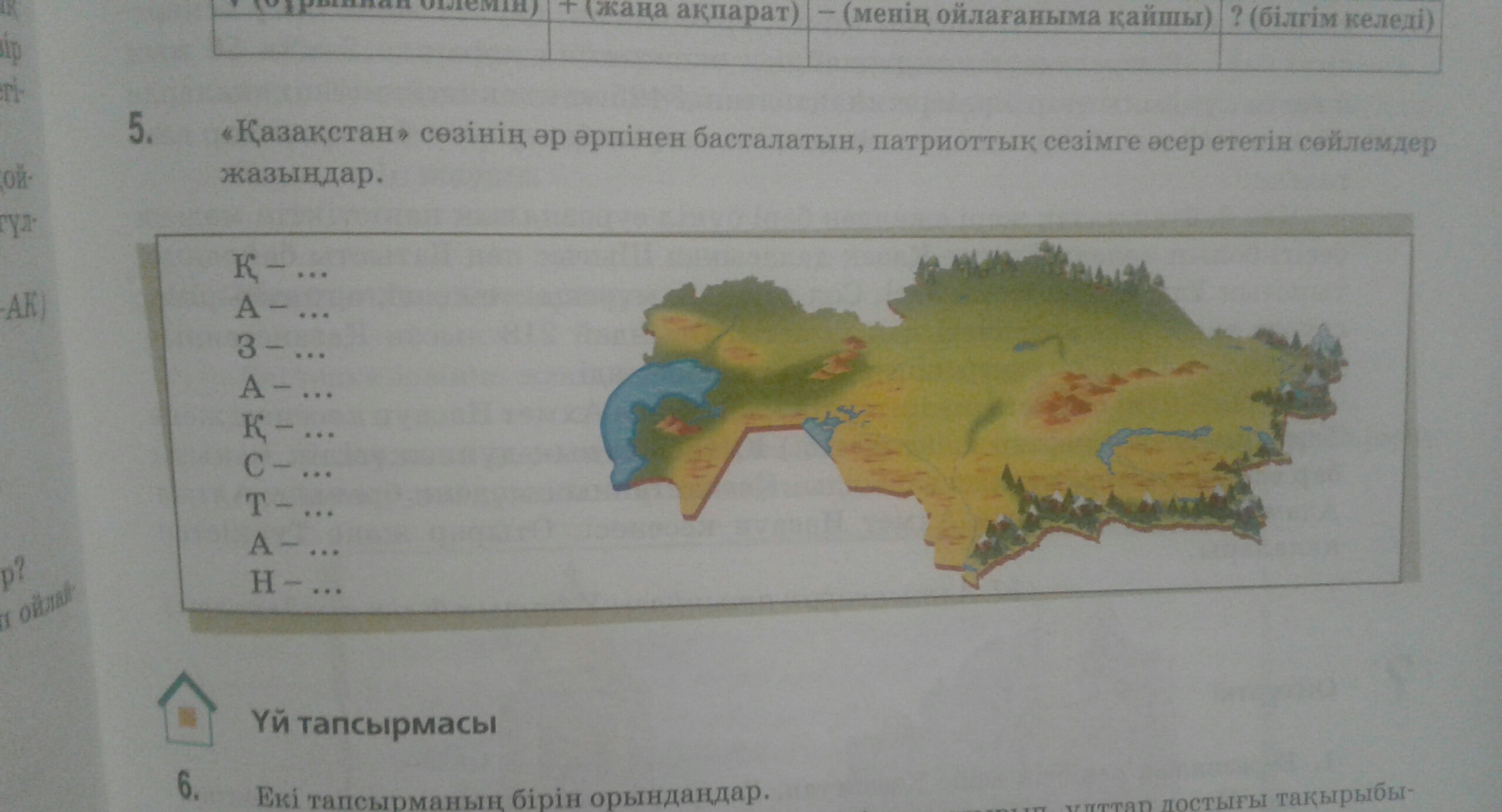 "Қазақстан" сөзінің əр əріпінен басталатын патриоттық сезімге əсер ететін сөйлемдер жазу.