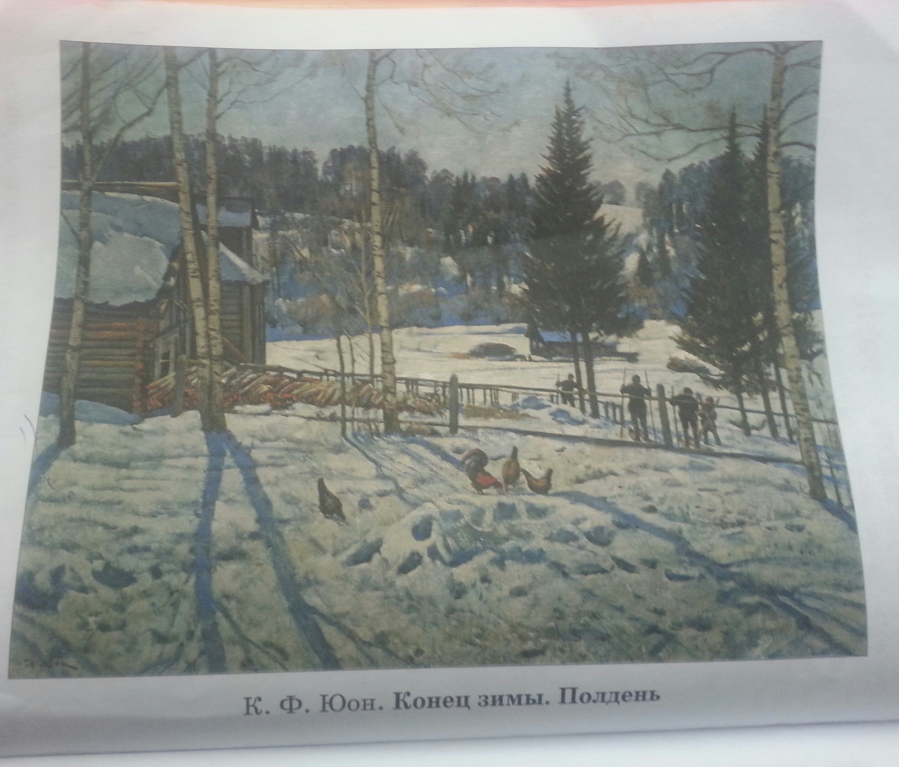 На картине изображена небольшая деревушка, которая находится на небольшой опушке. Светит яркое, но прохладное солнце. Большие серебристые сугробы поблескивают на солнце. Во дворе дома посажены березы, они словно стройные девушки. Так же во дворике безмятежно ходят курочки и что-то клюют. Небо на картине голубое и безоболочное, так как все начинает принимать весенний тёплый вид.