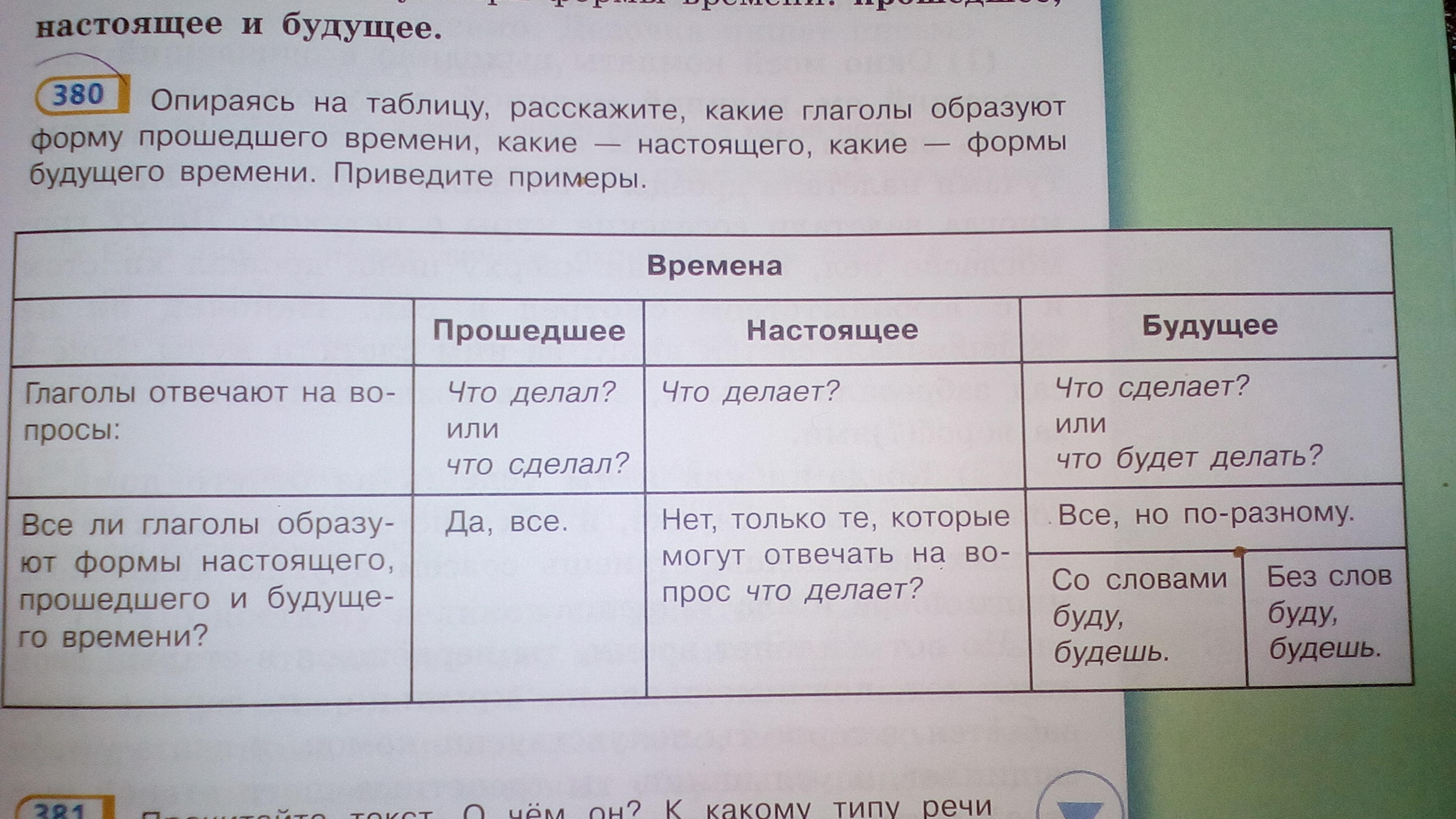 надо запоминать у прошедшего времени всегда суффикс л ; у настояшего всегда которое делается моментально; в будушем когда то сдделается будет делать вопрсы пр.время что делал, что сделал,наст.время что делает,буд. время что будет делать, что сделает.