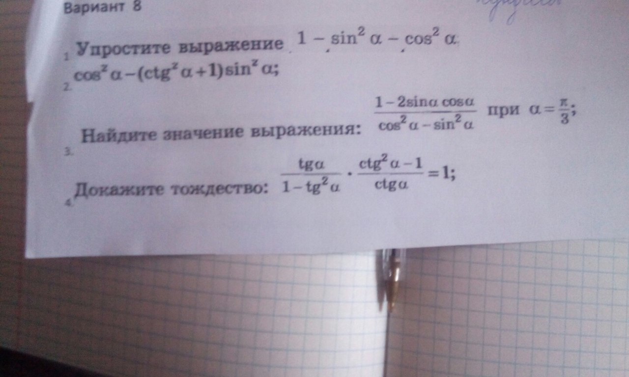 3)(1-2sinacosa)/cos^2a-sin^2a= 1-sin2a/cos2a при п/3 выражение принимает значение (1-sin2*п/3)/cos2*п/3= 1-2*sqrt3/2/2*1/2=1-sqrt3