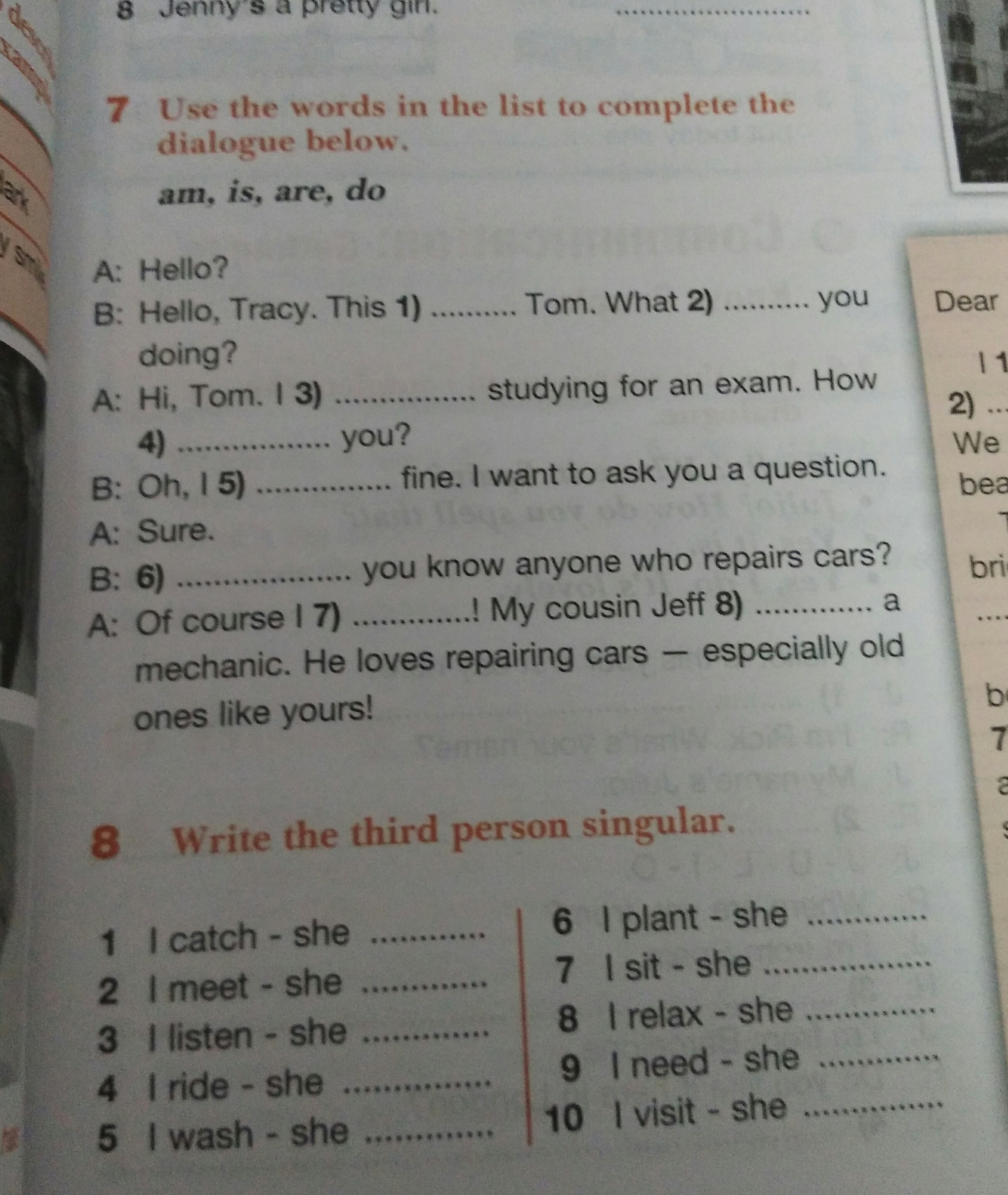 She catches meets listens rides washes plants sits relaxes needs visits.