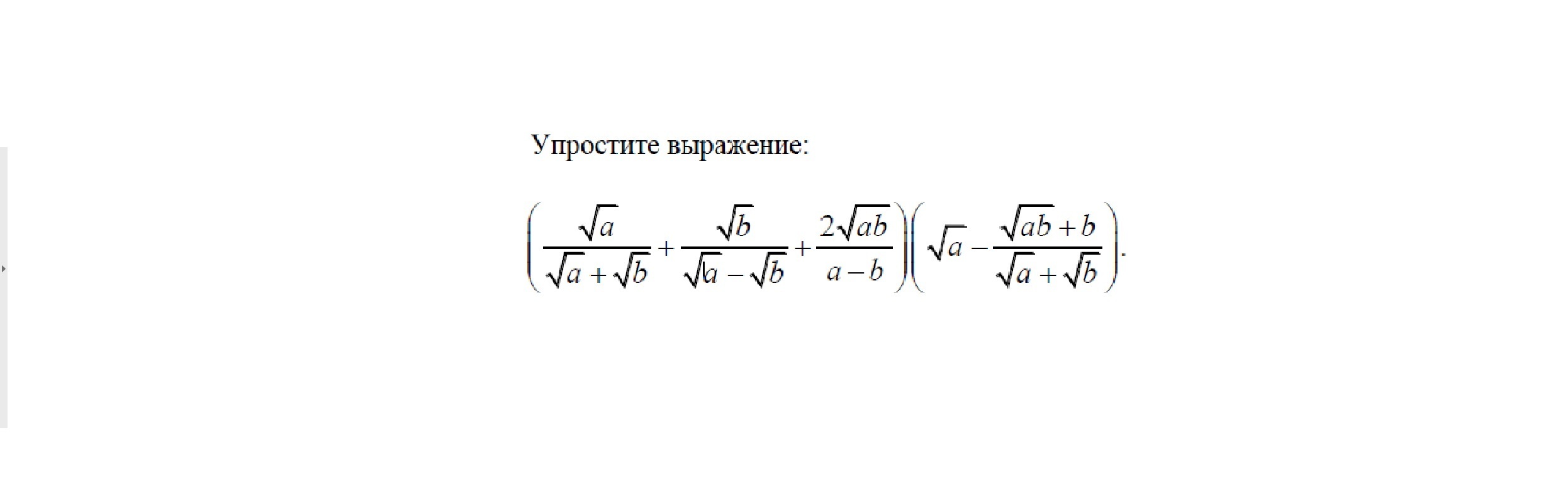 ( frac{ sqrt{a} }{ sqrt{a}+ sqrt{b}  } + frac{ sqrt{b} }{ sqrt{a}- sqrt{b} } + frac{2 sqrt{ab} }{a-b} )( sqrt{a} - frac{ sqrt{ab}+b }{sqrt{a}+ sqrt{b} } )=\\=( frac{ sqrt{a} *(sqrt{a}- sqrt{b})}{ a-b  } + frac{ sqrt{b}*(sqrt{a}+ sqrt{b}) }{ a-b} + frac{2 sqrt{ab} }{a-b} )(  frac{ sqrt{a}(sqrt{a}  + sqrt{b}) }{sqrt{a}  + sqrt{b}}  - frac{ sqrt{ab}+b }{sqrt{a}  + sqrt{b} } )=\\