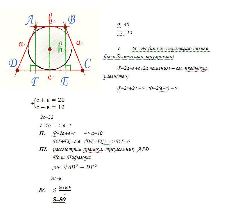 Периметр равнобедренной трапеции равен 40. Разность длин оснований трапеции рана 12. Найдите площадь трапеции, если известно, что в нее можно вписать окружность.
